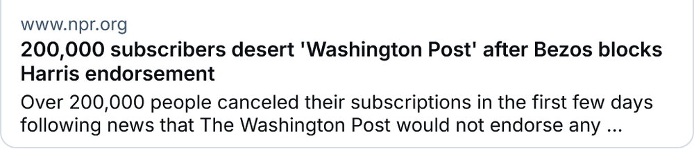 That's 8% of total subscribers lost over the weekend. And counting. https://www.npr.org/2024/10/28/nx-s1-5168416/washington-post-bezos-endorsement-president-cancellations-resignations all because their absurdly wealthy, cowardly owner wanted to suck up to the wanna-be dictator who's going to lose the election15 points
