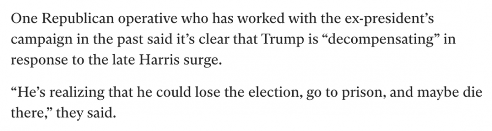 I know I'm wishcasting but... I don't know any typical Democrats are who are so turned off by Harris that they would consider voting for Trump, but I know several typical Republicans (myself included) who are repulsed by Trump to the point of either not voting, or even voting for Harris. Multiply that by thousands and let's see how things turn out. Just my personal anecdote from N. Dallas burbs.27 points