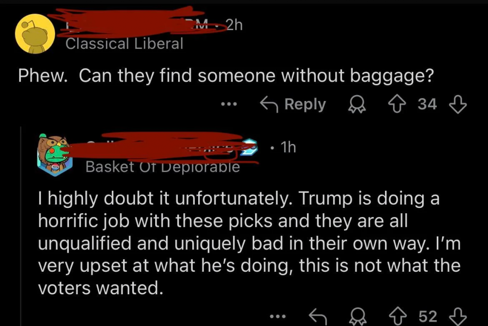 "This is not what the voters wanted." Dude. The voters wanted stupid performative shit to own tha libz. They are getting EXACTLY what they wanted. When you look at the menu, the item says "Shit sandwich, made with real shit," and you tell the waiter "I want the shit sandwich, made with real shit," you cannot complain when the waiter delivers to you a shit sandwich, made with real shit.12 points