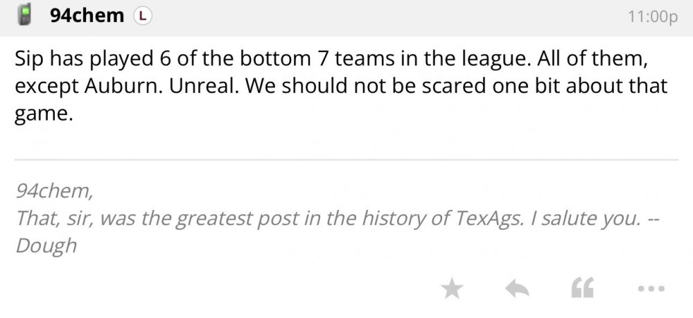 I'm having a miserable, miserable weekend after getting a bunch of really bad medical news, sobbed all friday into this morning. I'm still elated and this saturday rules. Please Texas, turn next week around for me and destroy those motherfuckers, I need something to keep me cheered up.28 points