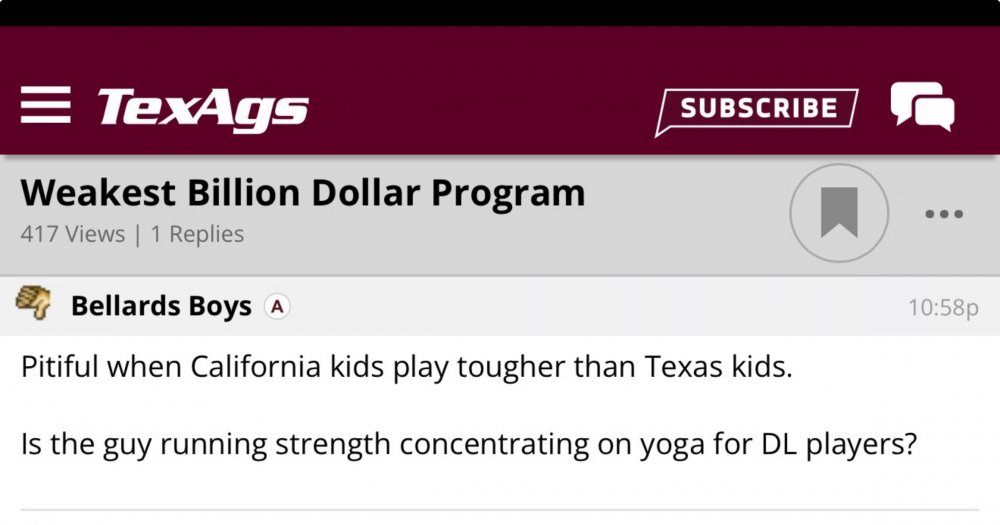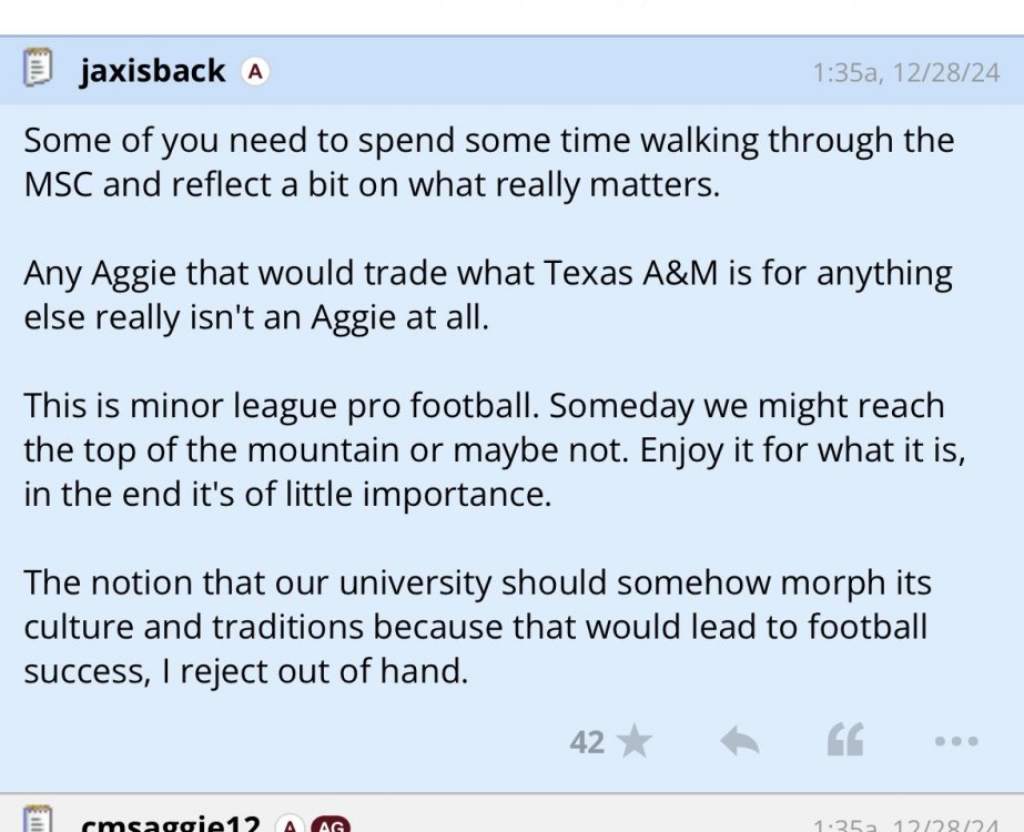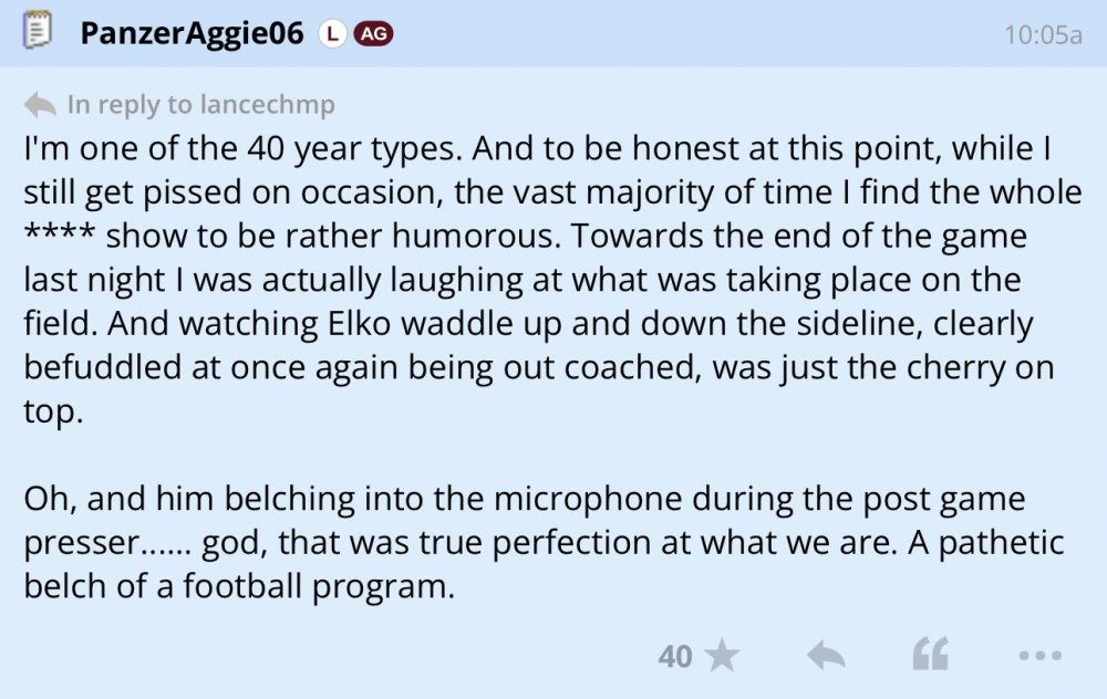 I can only speak for myself but I’m shattered that OU and Aggy lost. We are now part of the SEC, which is a brotherhood that transcends sports. It’s more than a football conference. It’s a shared culture and belief system, that fills us with pride and purpose. We cried with joy when Vanderbilt beat Georgia Tech, and we cried tears of shame and sorrow when Aggy fell. We may be rivals on the field, but at the end of the day, they are our brethren and while we’re not there yet, with hard work, we can be truly SEC-ready. Next time you feel a need to write something unpleasant on your TexAgs troll account, think about how you are ultimately hurting your family. It just means more. Hope this helps.39 points