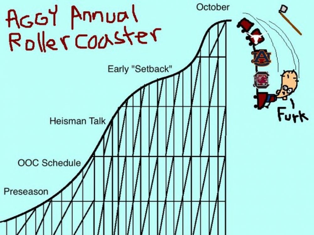 The roller coaster is glorious. They would probably be OK with their record if they had dropped a game or two earlier in the year to keep their expectations in check, like say swap the Arkansas and Auburn results. However, sitting at 7-1 and 5-0 in the SEC had them dreaming about the playoffs and national championships. But when that roller coaster starts downward, the ride is just so hilarious. They fall for it... every time.16 points