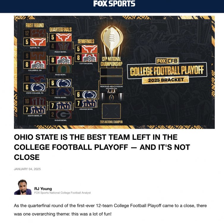 It's not just well known morons like Mike Farrel (probably the dumbest commenter on CFB and I'll never understand how he still has any platform) but even Klatt who is one of if not the top analyst out there is caught up in recency bias. I don't think it helped he was at the Rose Bowl and clearly didn't watch our game closely, but his analysis of the Peach Bowl was caveman level. Focusing on the box score and completely ignoring all of the extremely low percentage plays that hit for ASU to get to those last few minutes (and that racked up a ton of those yards). Our post game win expectancy per connelly metrics was like 90+%. It was very similar to the Tech loss in Lubbock a couple of years ago (right down to fucked up TOP killing our D down the stretch due to scoring so quickly early on). Everyone is completely taking the narrative that Texas was gifted the game by officials (ignoring the dozen plus patently absurd calls and no calls in ASU's favor) and forgetting that Ohio State has in fact looked human in games this year as well (and were similarly written off with speculation Day would be fired this time last month). There is a reason this is a 6 point spread and not a 17 point spread but everyone is talking about this game like it's the latter. OSU may very well win, and are rightfully favored, but the disrespect this team is being shown is a bit over the top. Good. I hope OSU listens to that shit all week and walks in expecting a cakewalk.14 points