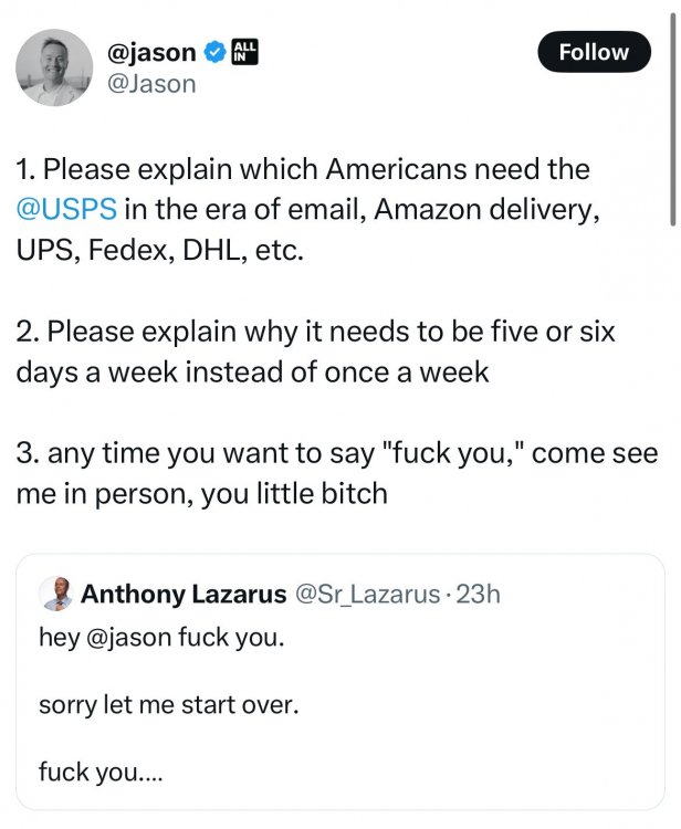 Really enjoying the new MAGA post office discourse and the complete lack of awareness that Amazon, FedEx, and UPS donβt function without USPS. But I honestly hope this happens. Between once a week mail delivery, cutting government jobs, slashing Medicaid and Social Security, and tariffs itβs almost impossible to imagine a program designed to inflict more pain on MAGAβs voter base. Enjoy it, rural old America. Itβs even funnier because youβre all too dumb to realize you did it to yourselves. LOL.10 points