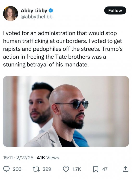 The fucking Tate thing is infuriating. The new face of America, pushing to have rapists and sex traffickers escape accountability because their audience is MAGA. What a disgusting, repulsive image to present to the world. I want to think that this would embarrass people who voted MAGA but I know it wonβt. The libs donβt like rape, so rape is now MAGA-adjacent.12 points