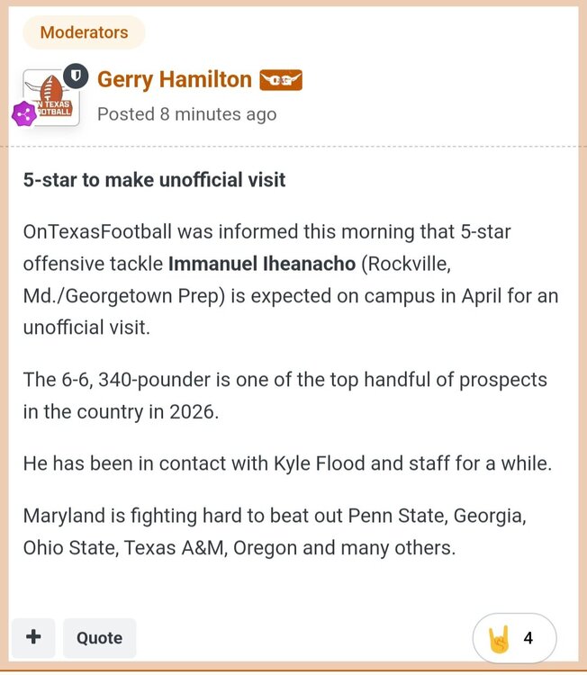 Good update here from Gerry: Football recruiting notes OnTexasFootball delivers a few football recruiting notes to go with your morning brew. Roseborough back on campus ... Clearwater (Fla.) High 4-star++ OT Samuel Roseborough was back on campus a few days ago, marking his second visit of the spring with another to come. Of course, his mom now lives and works in Austin, so the 6-foot-5, 275-pounder is around campus more than most prospects. OTF can report that Roseborough rated recent visits to Michigan and Texas A&M behind Texas. OTF believes the Horns hold a decent lead right now. OTF continues to believe the Longhorns lead for Roseborough, 4-star+ IOL Toa Katoa (Euless, Texas/Trinity) and 4-star+ IOL Nicolas Robertson (Klein, Texas/High). And the Longhorns are at least a 50-50 shot with 5-star OT John Turntine III (Fort Worth, Texas/North Crowley), 4-star++ OT Felix Ojo (Mansfield, Texas/Lake Ridge) and 4-star+ OT/IOL Sam Utu (Orange, Calif./Lutheran). Two defensive lineman to know ... IMG Academy (Bradenton, Fla.) via East Northport, N.Y. 4-star defensive lineman Preston Carey has real interest in Texas. OTF expects the 6-foot-4, 310-pounder to make an unofficial visit in April. Depending on that visit, a June OV is likely/possible. The Texas staff likes Carey over the ball. He's seen as a more athletic version of Bill Norton. As OTF has mentioned, 4-star+ defensive lineman Damari Simeon (Richland, N.J./St. Augustine) will visit April 12. Texas is expected to make a big push so long as Simeon is close to the listed 6-foot-3 and 270-275 pounds. Ohio State, Penn State, Tennessee, Auburn, North Carolina and Oklahoma are considered the main competition early on. In case anyone missed this with the wild day on the Forty Acres ... Marietta (Ga.) Kell 2026 4-star+ Brayden Rouse tells OnTexasFootball he is making an unofficial visit to Texas April 17. Rouse, 6-3 and 210-pounds, was offered by Johnny Nansen January 29. The Peach State rangy LB with closing speed has June OV’s scheduled to Michigan June 6-8, Georgia June 13-15 and Tennessee June 20-22. Texas will be working to replace on of the June visit dates with the first ever visit to Texas next month.14 points
