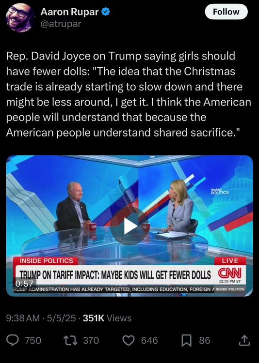 I didn't watch the entire interview, and perhaps it's unintentional but he's been 'looping' the schtick about girls and it rankles. Perhaps because the cult supports the misogyny and that part is personal for me, but listening to one of the most materialistic human beings on the planet tell parents to suck it up when we know for many it won't be about dolls or pencils it will be about food and shelter is just gah....I can't.9 points