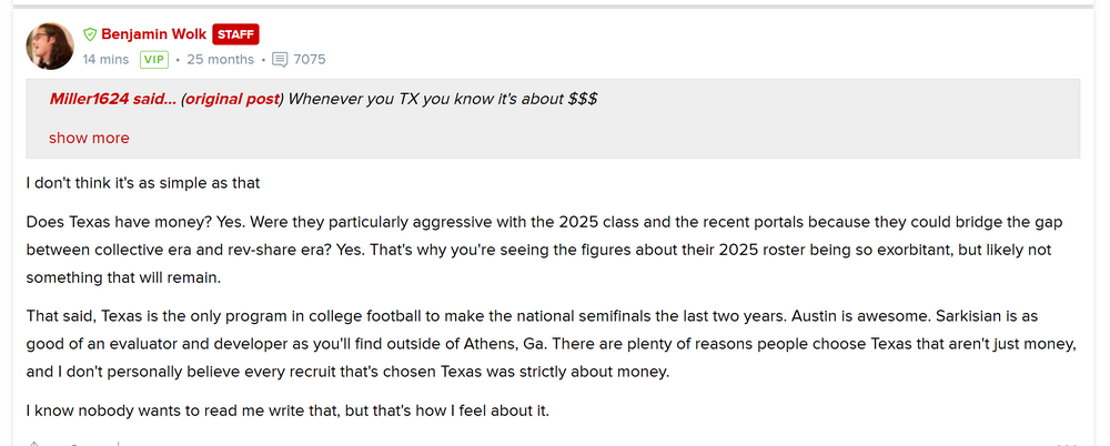 I think this deserves its own thread for discussion for now and going into the future as I think this is the beginning of a trend. https://www.on3.com/teams/texas-longhorns/news/texas-athletics-totaled-331-9-million-in-revenue-in-fy-2024-thanks-to-the-most-profitable-football-program-in-the-sec/ Beyond the title, which is not inflated or bullshit. Texas Football by itself was responsible for over 204M in revenue and the next closest SEC school was sub 150M. Football by itself operated with a 139M surplus. Absolutely fucking staggering numbers.15 points