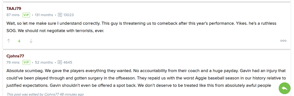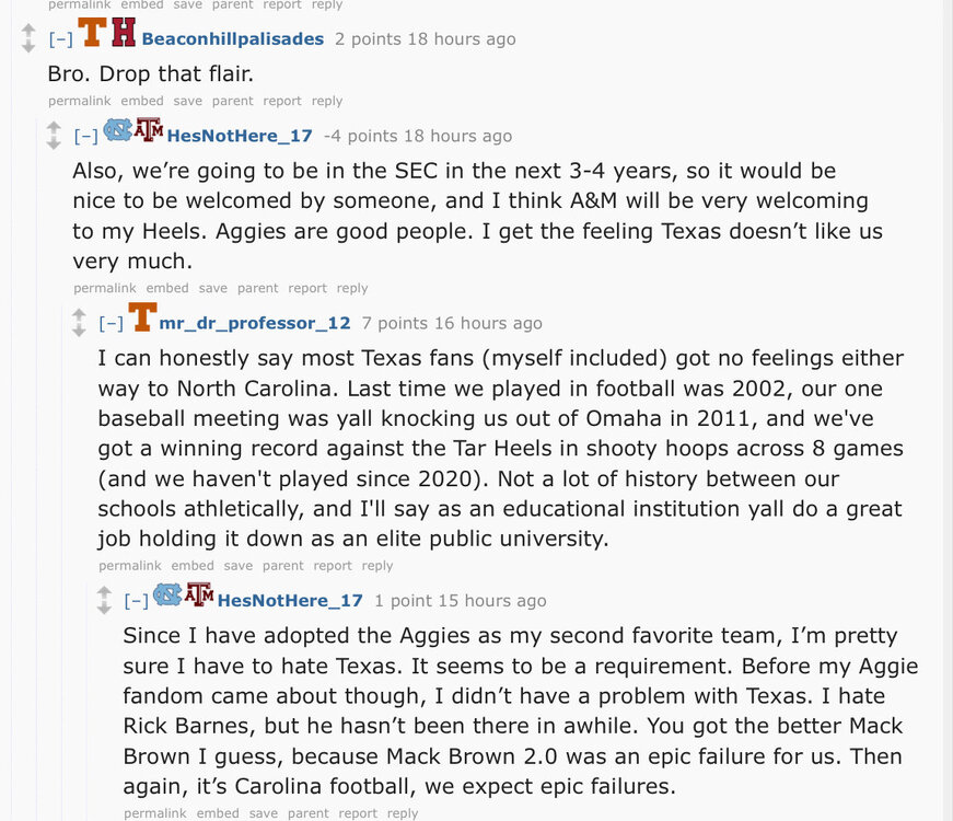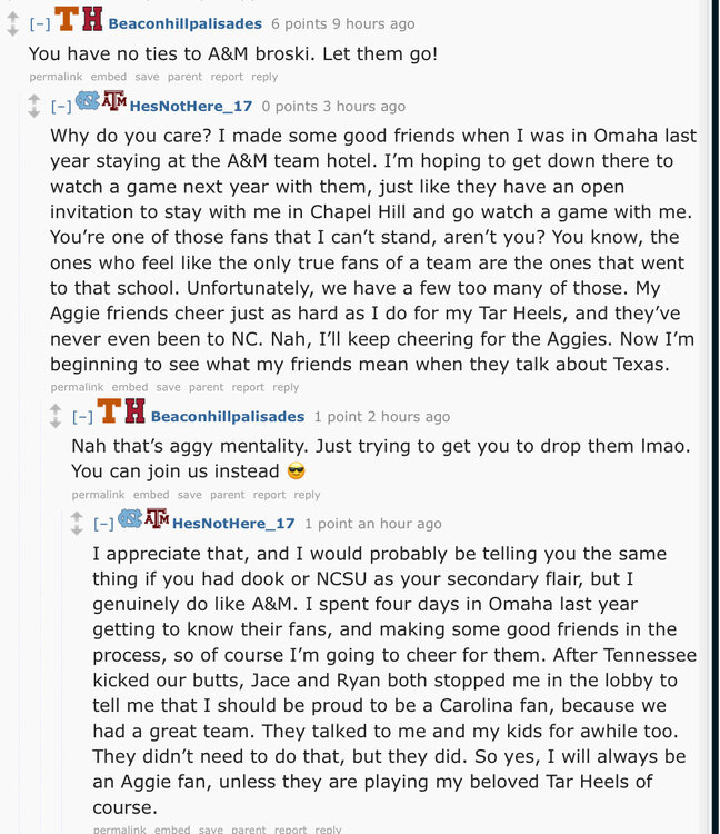 We got a βUNC fanβ that had such a great time in Omaha and was treated so well by all the Aggie fans and players that heβs now rooting for the A&M and doesnβt understand why all the other SEC teams are shitting on the Aggies. He also hopes that when UNC joins the SEC that they will be welcomed into the SEC brotherhood by A&M.7 points