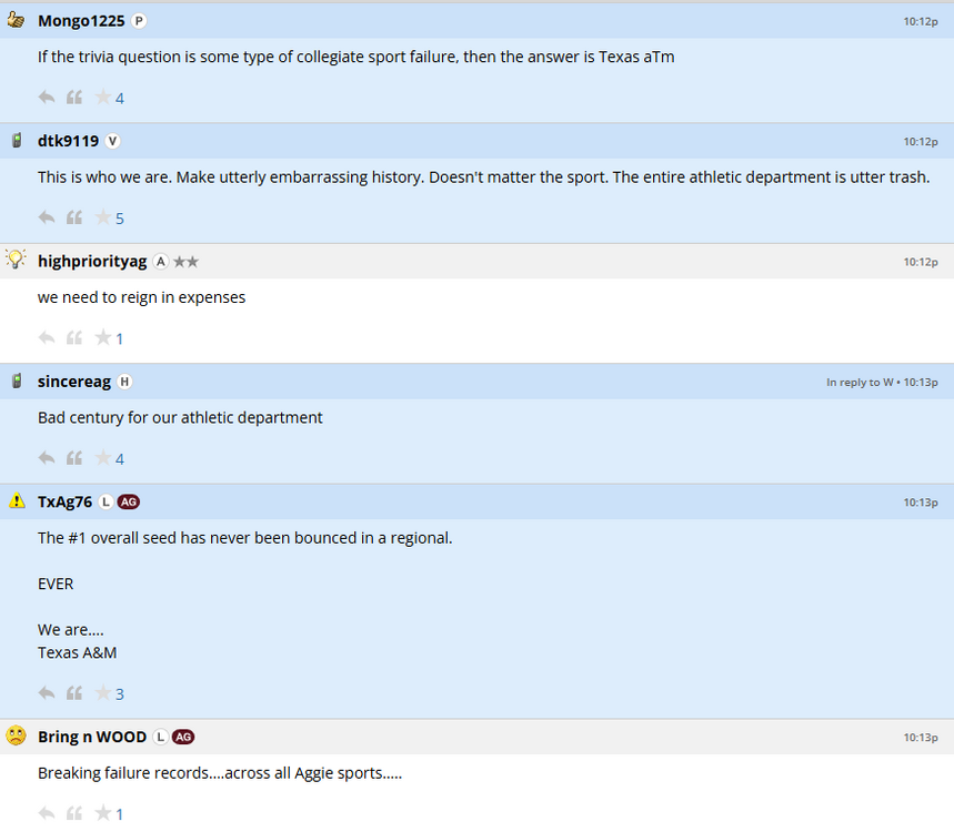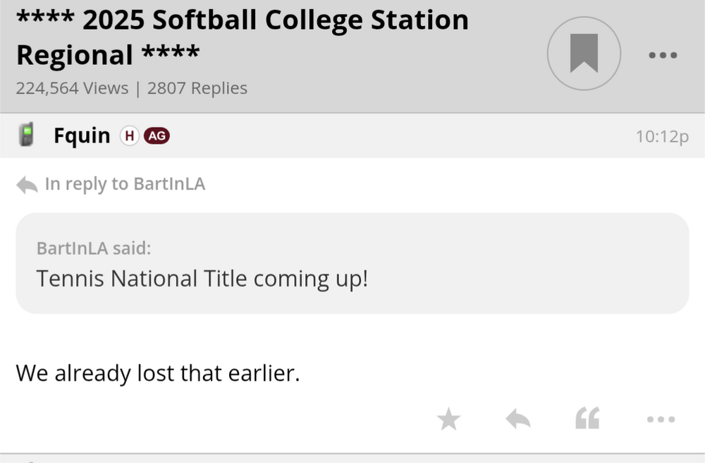 Page 1 of the Texags softball tourney thread... "We've got an easy draw " Page 83. "If the tourney is seeded, there's no reason Liberty should be in our bracket."31 points