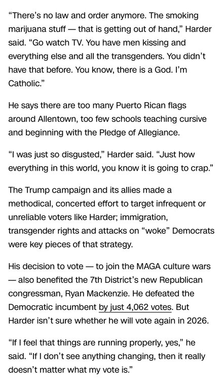 Weβre living here in allentown genX Todd has never voted in his life before 2024. Votes trump. Views the world has βgone to crapβ because 1) no law and order 2) people smoking weed 3) gays and trans on tv 4) brown people 5) cursive 6) pledge of allegiance in school A lot to unpack 1) Todd thinks the convicted felon who instigated J6 will revive law and order 2) State law for medicinal, dumbass 3) hey snowflake, remember bowie and culture club from like 40 years ago. 4) puerto ricans are american citizens, dumbass. 5) cursive? Seriously? What happened to your brain that made this even register as a talking point? 6) State law. In Pennsylvania - a student must provide written notice from a parent or guardian to gain exemption. Talk to your local school board about the pledge of allegiance Somebodyβs been watching foxnews. A lot. Iβm embarrassed this idiot is genX. Also, cursive. Regarding allentown, billy joel told genX to leave there 40 years ago. You probably saw the PSA video wedged between the culture club, bowie, george michael, queen, and elton john videos.10 points