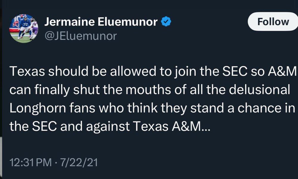 That shit is fucking hilarious. They couldn't be more wrong about several of their talking points if they tried. 1) NIL and LHF donors are dying off and mostly olds. - The olds in the donor base do not, generally, have any interest in helping with NIL. The reality is that the largest donors to NIL are all under the age of 50. The absolute idiocy in their take otherwise is only matched by their bizarre certitude. 2) Asians don't like sports. - Never mind the stereotyping trending towards abject racism and just consider any single poster's own experiences in life on this one. Some of the most fanatical "fans" I've been around have been people of Asian ethnicity. Little league, hs football, Texas sports, whatever. Just a dumb, ignorant POV. 3) Tito Beveridge, that rat bastard, is giving Texas anything they want for NIL. - We've been through this and the complete fallacy of it. As we predicted, it's now fact. I take comfort in seeing their inability to understand circumstances as they are and willful ignorance towards anything that paints Texas as having a sustainable advantage on any front. That stuff has always been their problem and access to constant flows of clear information has done nothing to change it.22 points