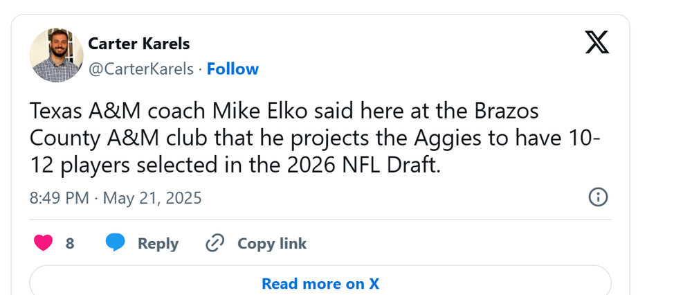 Lulz. At the Brazos Valley A&M Club. The libations must have been strong. And copious. And imbibed sans inhibition. (The last time they had 10 players selected? 1976 ... when they apparently had at least 14 rounds in the draft.) Lulz. "Retained the coaching staff." Ha ha ha ha ... had to fight the poachers off with baguettes and breadsticks!27 points