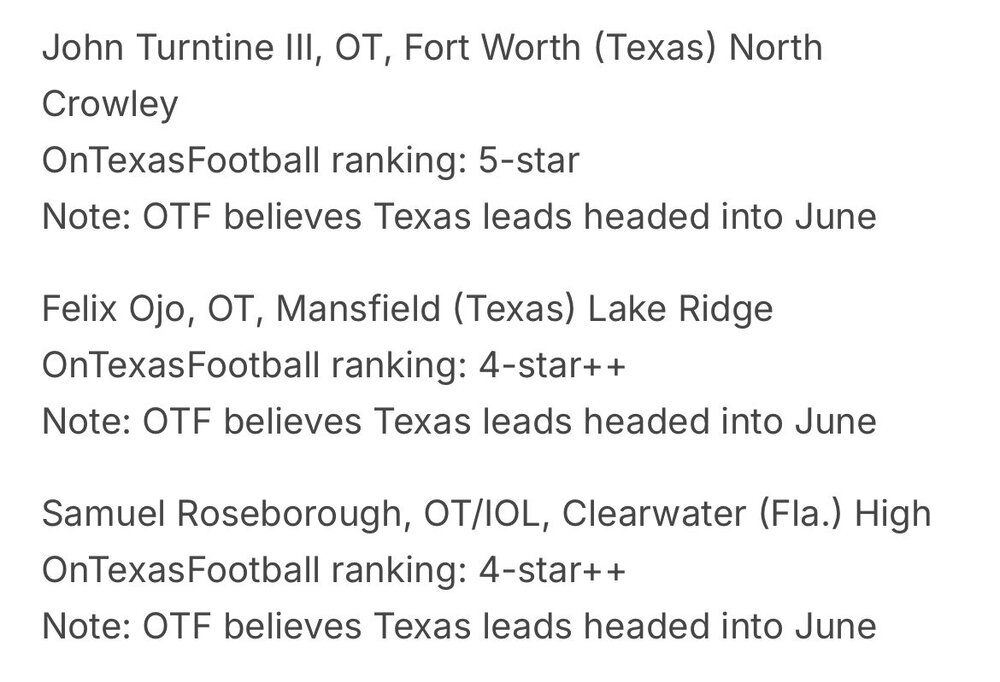 Gerry Hamilton Recruiting: Where things stand The majority of the Texas staff has wrapped up the spring evaluation period that allow for two in-person evaluations/in-home meetings. The staff is expected to take a few days off next week prior to the hectic month of June that will be centered around official visits and two Elite Camps for 2027 and 2028 prospects. With the staff's work in May done, OnTexasFootball takes a look at where things stand after talking to a number of sources throughout this week. The current class ... The Longhorns are sitting at eight commitments, headlined by 5-star QB Dia Bell and 4-star++ do it all playmaker Jermaine Bishop Jr. Six of the eight commitments are from inside the state line. Three are considered Houston area, two DFW and one CenTex. The numbers for the class ... These numbers can fluctuate positionally a little. QB - 1 RB - 2 WR - 3 TE - 2 OL - 5 DL - 3 or 4 EDGE - 2 LB - 3 DB - 4 or 5 Specialist - 2 The official visitors list ... OTF currently has Texas down for 53 official visits next month. We do not believe all of those visits will end up happening. And OTF also believes there will be 2-3 more OV's added to the list. The number is likely to end up from 49-53 for the month. Current breakdown by state: Texas - 17 Georgia - 10 Florida - 6 Louisiana - 4 California - 3 Alabama - 2 New Jersey - 2 Hawaii - 2 Arizona - 2 Mississippi - 1 North Carolina - 1 Pennsylvania - 1 Oklahoma - 1 Virginia - 1 Trending Texas ... There are several prospects that OnTexasFootball believes the Longhorns are leading for, or have near 50-50 shots at. K.J. Edwards, RB, Carthage (Texas) High OnTexasFootball ranking: 4-star+ Note: OTF believes Texas leads headed into June Jalen Lott, WR/ATH, Frisco (Texas) Panther Creek OnTexasFootball ranking: 4-star++ Note: OTF expects this to come down to a west Coast school vs. Texas Kaydon Finley, Aledo (Texas) High OnTexasFootball ranking: 4-star+ Note: OTF expects this to come down to Notre Dame vs. Texas Mark Bowman, TE, Santa Ana (Calif.) Mater Dei OnTexasFootball ranking: 5-star Hezek Kent, TE, Brunswick (Ga.) High OnTexasFootball ranking: 4-star++ Note: OTF believes Texas leads headed into June John Turntine III, OT, Fort Worth (Texas) North Crowley OnTexasFootball ranking: 5-star Note: OTF believes Texas leads headed into June Felix Ojo, OT, Mansfield (Texas) Lake Ridge OnTexasFootball ranking: 4-star++ Note: OTF believes Texas leads headed into June Samuel Roseborough, OT/IOL, Clearwater (Fla.) High OnTexasFootball ranking: 4-star++ Note: OTF believes Texas leads headed into June Zaden Krempin, IOL, Prosper (Texas) High OnTexasFootball ranking: 4-star Kendall Guervil, DL, Fort Myers (Fla.) High OnTexasFootball ranking: 4-star++ Note: OTF believes Texas leads headed into June Damari Simeon, DL, Richland (N.J.) St. Aug OnTexasFootball ranking: 4-star++ JaReylan McCoy, DL/EDGE, Tupelo (Miss.) High OnTexasFootball ranking: 4-star+ Dre Quinn, EDGE, Norcross (Ga.) Greater Atlanta Christian OnTexasFootball ranking: 4-star+ Xavier Griffin, LB, Gainesville (Ga.) High OnTexasFootball ranking: 5-star Note: OTF believes Texas leads headed into June Kosi Okpala, Houston (Texas) Mayde Creek OnTexasFootball ranking: 4-star+ Note: OTF believes Texas leads headed into June Chace Calicut, S/LB, Houston (Texas) North Shore OnTexasFootball ranking: 4-star+ Samari Matthews, CB, Cornelius (N.C.) Hough OnTexasFootball ranking: 4-star++ Note: OTF believes Texas holds a slight lead over Clemson headed into June Texas is in the fight, but has work to do ... Ezavier Crowell, RB, Jackson (Ala.) High OnTexasFootball ranking: 4-star++ Kaiden Prothro, Bowdon (Ga.) High OnTexasFootball ranking: 4-star++ Malakai Lee, OT/IOL, Honolulu (Hi.) OnTexasFootball ranking: 4-star+ Sam Utu, OT/IOL, Orange (Calif.) Lutheran OnTexasFootball ranking: 4-star++ Lamar Brown, DL, Baton Rouge (La.) University Lab OnTexasFootball ranking: 5-star James Johnson, DL, Miami (Fla.) Northwestern OnTexasFootball ranking: 4-star++ Vodney Cleveland, DL, Birmingham (Ala.) Parker OnTexasFootball ranking: 4-star+ Bryce Perry-Wright, DL/EDGE, Buford (Ga.) High OnTexasFootball ranking: 4-star+ Luke Wafle, EDGE, Princeton (N.J.) Hun School OnTexasFootball ranking: 4-star++ Jake Kreul, EDGE, Orlando (Fla.) IMG Academy OnTexasFootball ranking: 4-star++ Jamarion Carlton, EDGE, Temple (Texas) High OnTexasFootball ranking: 4-star+ Brayden Rouse, LB, Marietta (Ga.) Kell OnTexasFootball ranking: 4-star++ Davon Benjamin, DB, Westlake Village (Calif.) Oaks Christian OnTexasFootball ranking: 4-star++ Justice Fitzpatrick, CB, Fort Lauderdale (Fla.) St. Thomas Aquinas OnTexasFootball ranking: 4-star++ Flip candidates ... With the exception of Mack, the flip candidates could play out into the season. Jabari Mack, WR, Destrehan (La.) High - *LSU commit OnTexasFootball ranking: 4-star++ Aaron Gregory, WR, Douglassville (Ga.) Douglas County - *Texas A&M commit OnTexasFootball ranking: 4-star++ Jaimeon Winfield, DL, Richardson (Texas) High - *USC commit OnTexasFootball ranking: 4-star++10 points