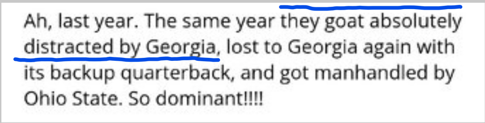 A few gems here. FROM LONGHORNFRENZY'S SCREENSHOTS, ABOVE Aggies lead in winning the "equivalent" of 10 games ... Don't ever - repeat, ever - "goat" absolutely "distracted" by Georgia, people ... FROM THE AGGIE 247 THREAD FOLLOWING ELKO'S COMMENTS (Candidate for a tagline ... π π π ) FROM AN AGGIE 247 THREAD ON AGGIE ATHLETICS9 points