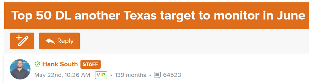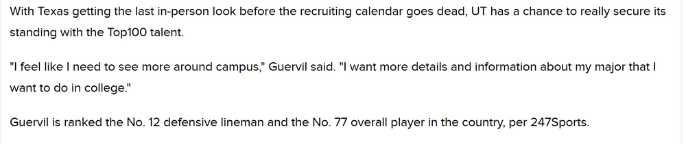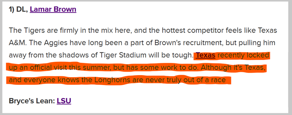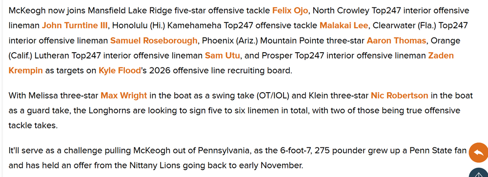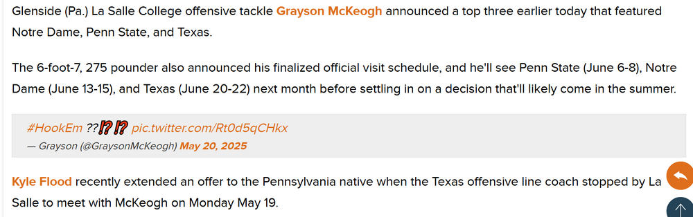 Your Saturday Smorgasbord 1) Horns 247 - Valdin Sone (from ... Sweden π) 2) Horns 247 - Kendall Guervil 3) LSU 247 - LAMAR BROWN (Lulz .. ) 4) Georgia 247 - Malakai Lee Honolulu (Hawaii) Kamehameha offensive tackle Malakai Lee has finalized his official visit schedule. The No. 1 offensive recruit in Hawaii, Lee had a final six of Alabama, BYU, Georgia, Michigan, Texas and USC. Now heβs down to four- with BYU and USC out and the final four being Alabama, Georgia, Michigan and Texas. He already took an official visit to Georgia on April 10 and the official visit to Michigan has long been set for June 20. But the other two dates are locked in. Lee will next hit the road next weekend when he takes his official visit to Alabama on May 30. It will be a quick turnaround, with Lee set to return to the mainland to visit Texas on June 6. He'll return to the visit slate on June 20 when he visits Michigan. And a decision could come shortly after. βI was thinking a week after I get home from my last trip,β said Lee. A four-star in the industry-generated 247Sports Composite Rankings, Lee is the No. 14 offensive tackle nationally and the No. 2 recruit in Hawaii in 2026. He has already been selected to play in the 2026 Polynesian Bowl. 5) Horns 247 - Grayson McKeogh (May be a tough pull from PA, but Flood only offered May 19, and we've made his Top-3 ... ) 6) Vodney Cleveland11 points
