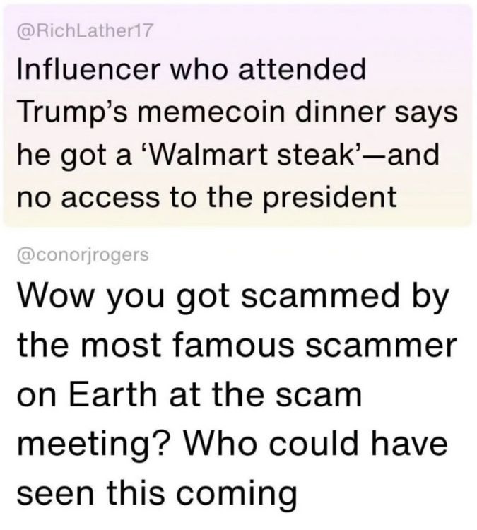To put it in sharp relief: Be brown and you once ran a stop sign back in 2012? You should be deported and/or shipped to a Salvadoran prison. Be white and commit $30 million in bank fraud, or steal $10 million of employee tax withholdings? FULL AND UNCONDITIONAL PARDON. But don't worry, folks. Remember......it's going to get a LOT worse. Wait until we get to type "be aligned with the administration and gun down political dissidents? Immediate full and unconditional pardon, pre-empting even the beginning of any DOJ prosecution."10 points