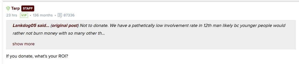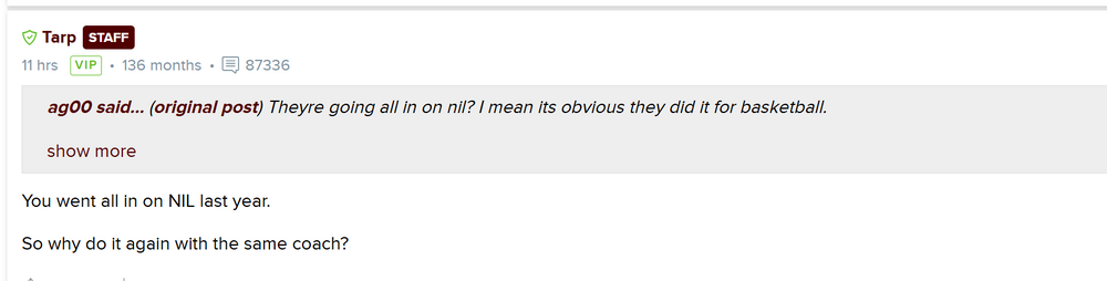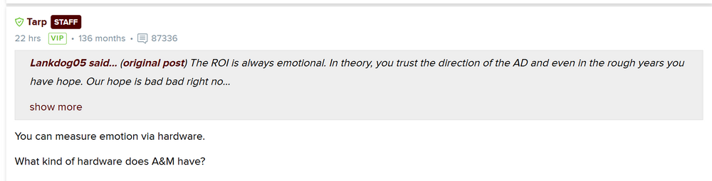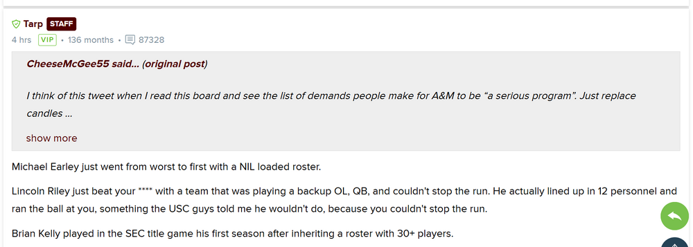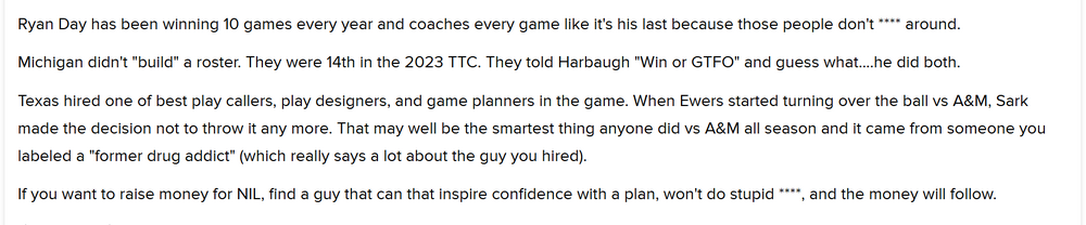 Tarp loves his Aggies. When they inevitably crater, he does a couple of things - - he seems to derive some perverse satisfaction from describing A&M's ineptitude in all its gory detail. Essentially delight in twisting the knife. - he goes into this mode of ascribing the failures to his subscribers. "You did xyz ..." "you gave Jimbo his contract ..." and so on. Pretty hilarious for us ... ahem, neutral π observers. A couple of instances: (think he means first to worst re: Michael Earley ... ) (Btw, the guy who referred to Sark as (a) "former drug addict", admitted in a subsequent post that that was a cheap shot, and called his "own foul". So there was that.) And ... Ouch ...11 points