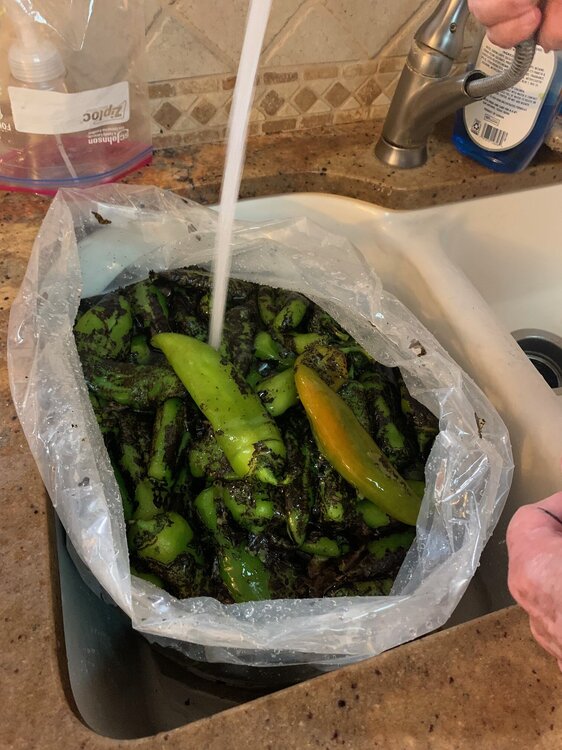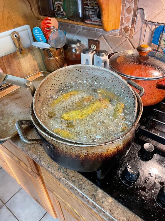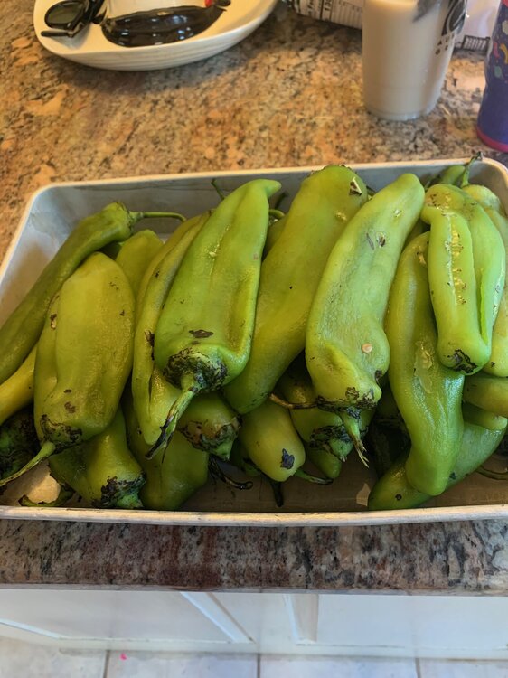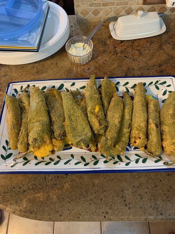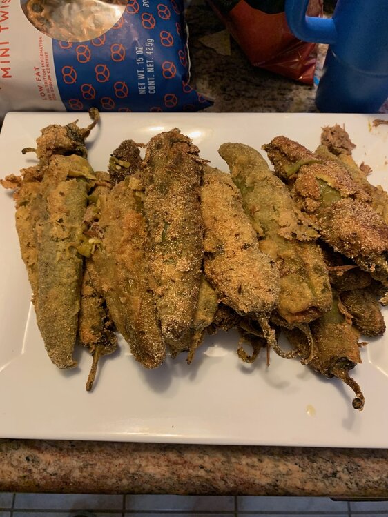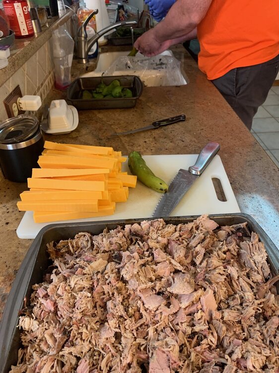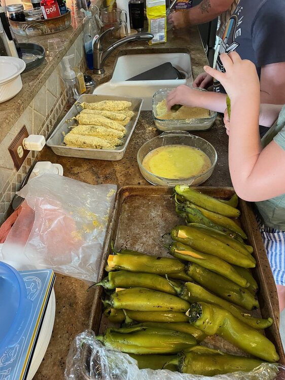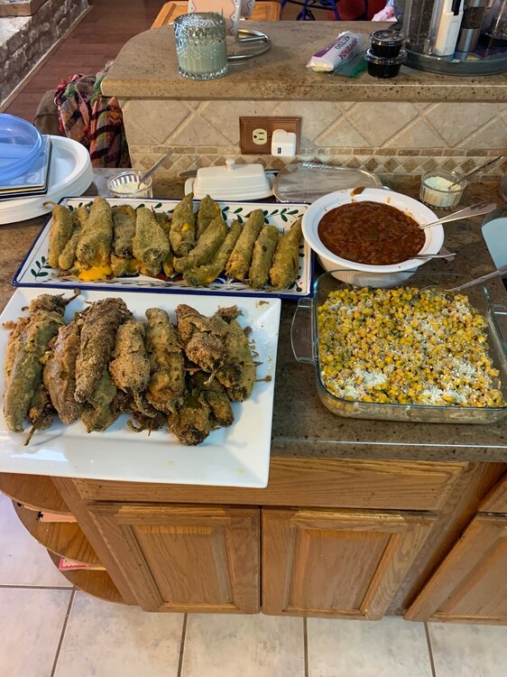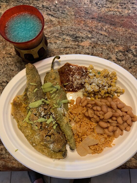 OK here we go. Hatch Green Chile Relleno Fest 2025 is in the books. We do this at my parents' house every year, and we had over 20 people between adults and kids, my full extended family on one side. This year we made two kinds, one stuffed with cheddar cheese (which is my dad's traditional version from west Texas) and one stuffed with pecan-smoked pulled pork. I of course had to be a rebel and made a few stuffed with BOTH! Step 1: Chiles fresh from the roaster, getting a cold water bath, and then ready to have the blistered skin peeled. This was an entire crate, something like 20 lbs of peppers. Somewhere between 80 and 100 maybe? After being peeled, first tray set aside for de-seeding. This was just one tray, there were 5 or 6 of them. Pecan smoked pulled pork, and cheddar cheese, ready to go as the fillings. The cheese-stuffed ones have been filled, and now they're going through an egg wash and then seasoned cornmeal, ready for the fryer. The fryer: A finished batch of cheese-stuffed: A finished batch of smoked pork: The final presentation with both kinds, plus the salsa pura for topping (made from green chile, onions, and tomatoes), a little cotija for topping, and some esquites. And my first plate, with a couple of each kind plus one of my combo rellenos, some Mexican rice, some beans, some esquites, the salsa pura, and some green chile salsa Dona. Oh and a blue margarita, my dad's specialty. Delicioso!11 points
