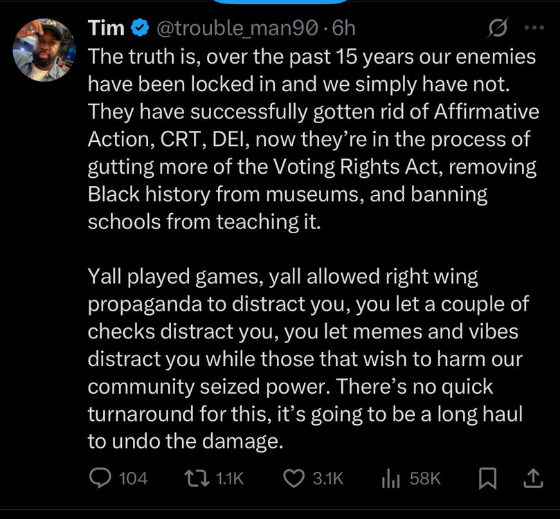 I've been shouting from the rooftops about this for years. I feel like Ian Malcolm in when the T-Rex broke out of the paddock and he said "Boy do I hate being right all the time." The Obama administration really broke something in these white nationalists' brains. Anytime Black people or other POCs obtain any type of advancement the backlash from white supremacists is swift. This current era feels like the post Reconstruction era, where the rights of Black Americans were stripped down after a betrayal by the Supreme Court and we were led into Jim Crow. JC Penny suits replaced the KKK hoods, but their motive is still the same, cripple Black voting power, hamstring Black economic advancement, attack HBCUs, gaslight and deflect while they do trifling stuff, etc. The effects of their efforts will trickle down to other POCs, just as it has done in the past. People underestimate just how many among our populace is still mad about the 1960s Civil Rights legislation, they really want a return to pre 1954.12 points