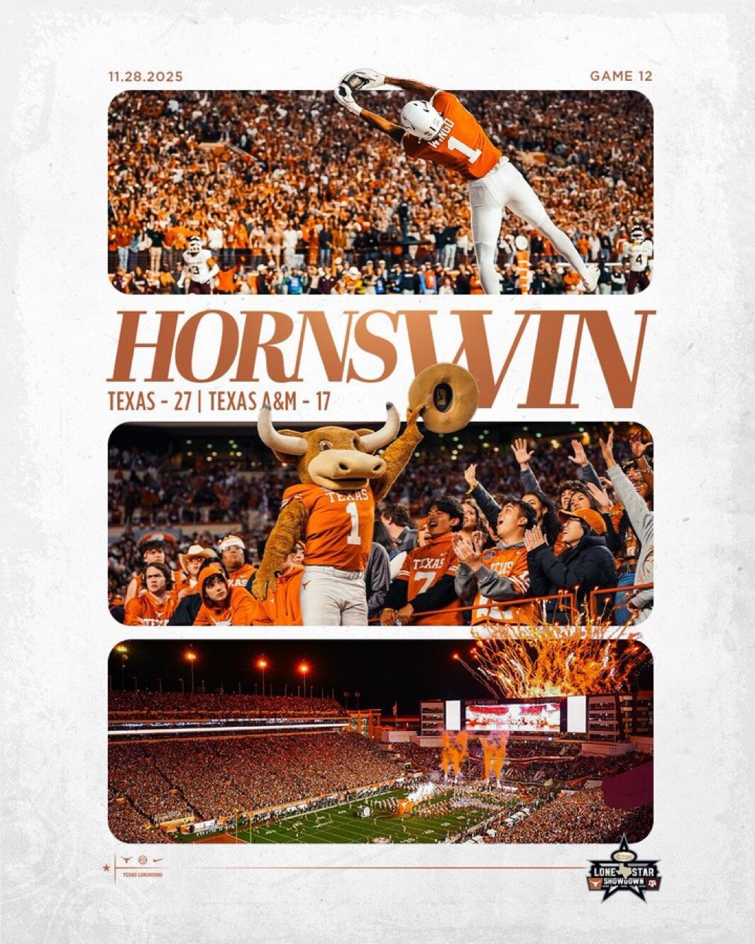 “Texas has the wins… and the brand” as the radio announcer vomits blood and his head spins around.3 points