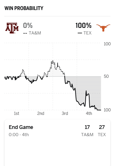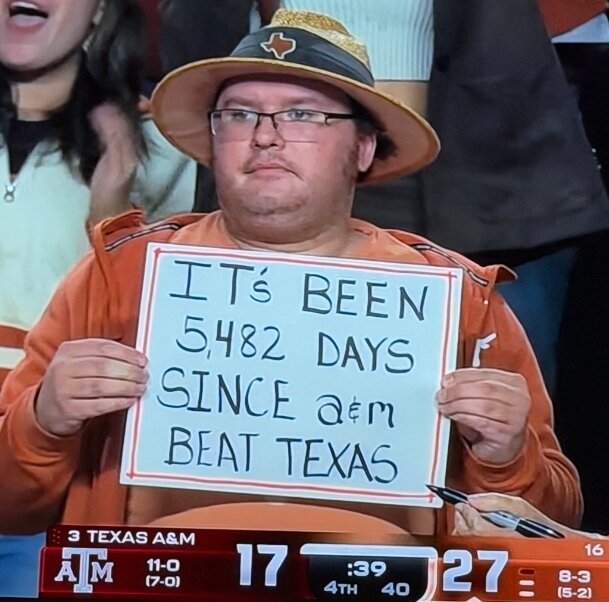 My section was like being at Kyle field. Screw you fair weather fans. Don’t renew your season tickets. It was like sitting in a sea of idiots. Thankfully Texas stabbed aggie in the heart multiple times.3 points