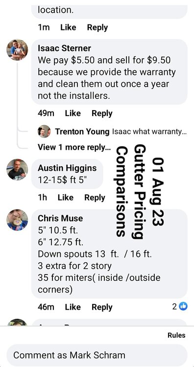 14. We do gutter work. Depending on your issues, we will potentially suggest a full sectional replacement. References: [mention=1107]gsoda3[/mention] We do both a 5" & 6" with 2×3 & 3×4 downspouts. A 7" product is available priced $ 4.75 added per foot vs. a 6" system. ★Again, ADDED★ A "box" gutter is possible but not suggested because this is in 10 foot sections vs. the common "aluminum, one piece seamless" & the 10 foot relies on sealant in every joint. We can only provide a 2 year warranty on that.