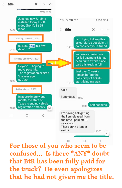 23. Apparently you missed the screenshot where BtR doesn't dispute that I paid him [emoji817]% for the truck AND he had issues in getting the title remade & NEVER actually did get me the title?