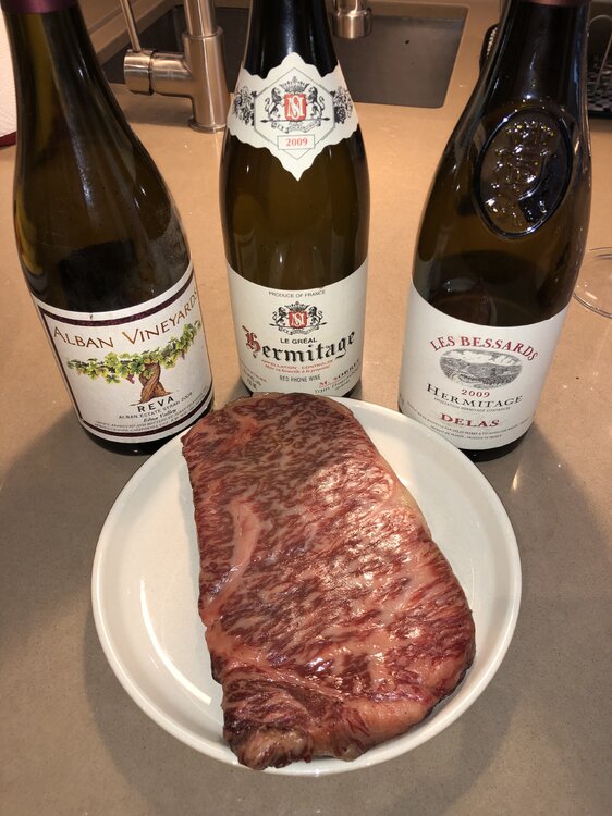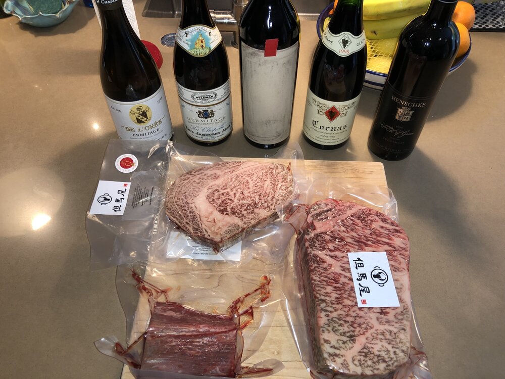 Tonight is 1998 Old World vs. New World Syrah with a little A5 accompaniment.