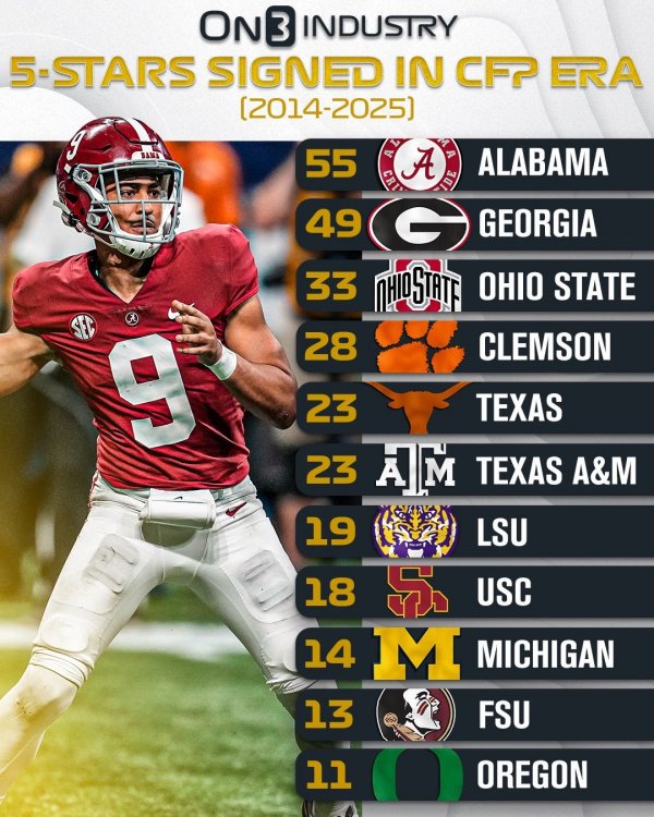 3. Alabama has averaged exactly five 5-stars per recruiting class since the CFP began. No one else has reached that threshold.