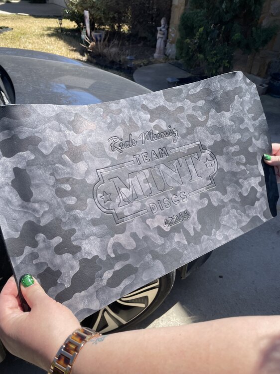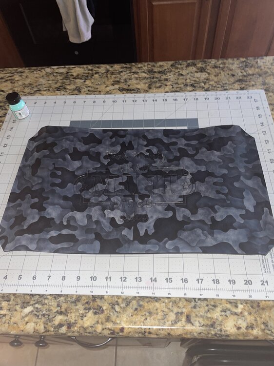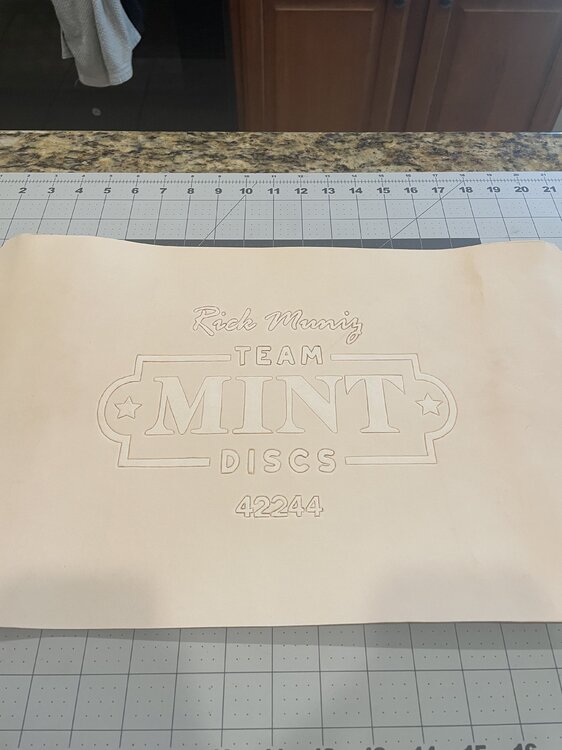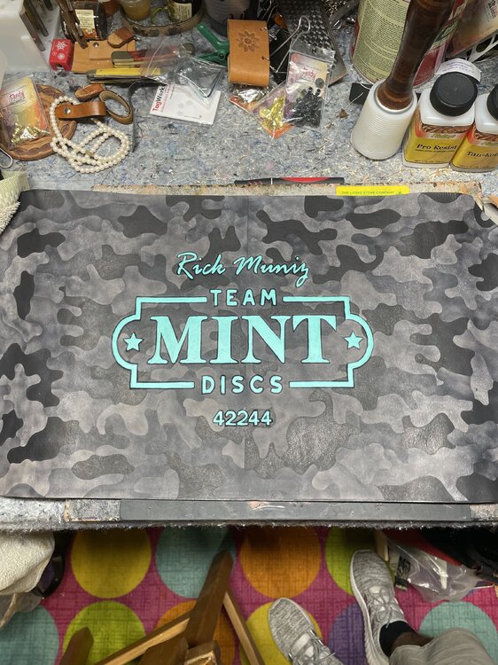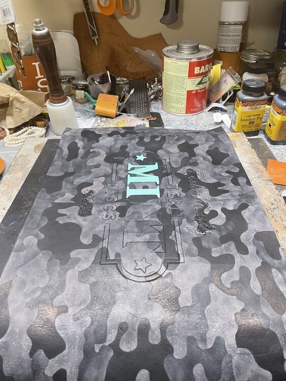 6. Got some orders and started my leatherwork up again. Check this out, I got an order for a camp chair top. They also requested a “black and grey camo” stain. I think I nailed it, but what do you think? (Still working on painting the logo and stitching it on.)