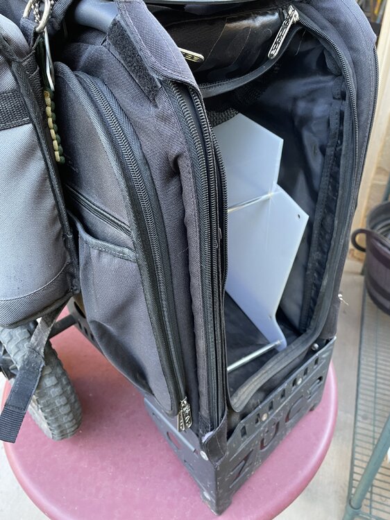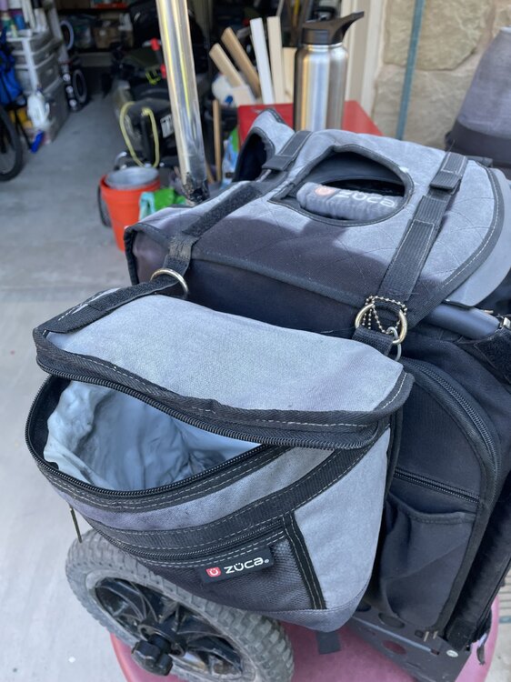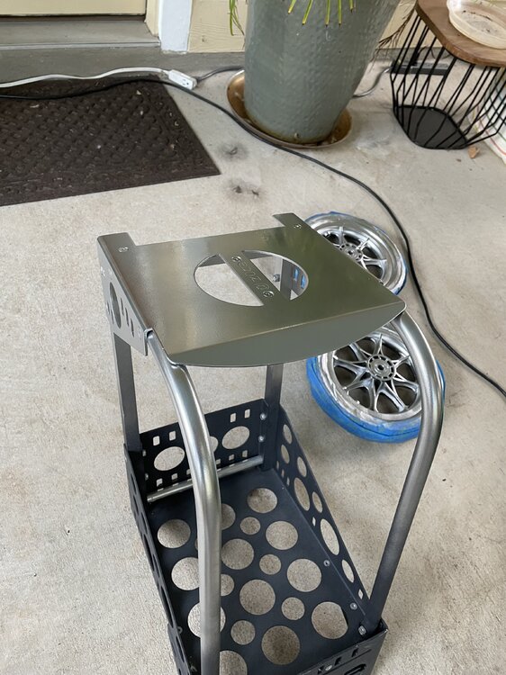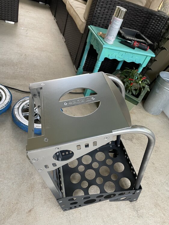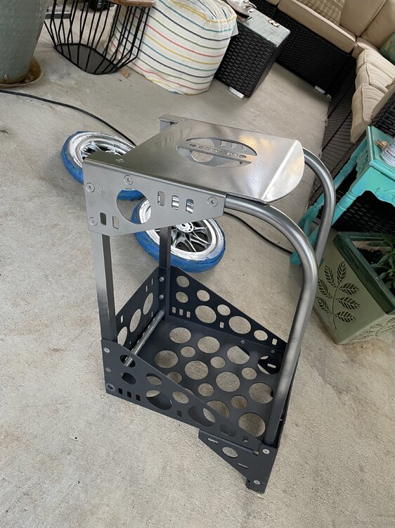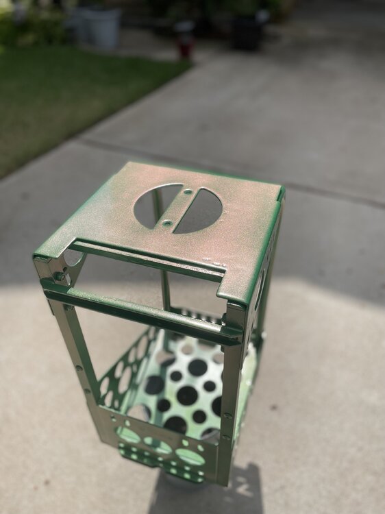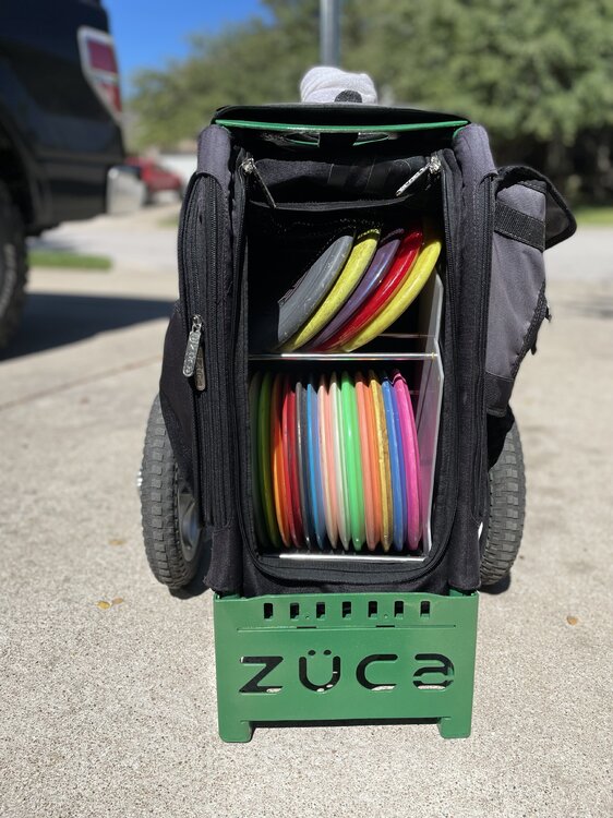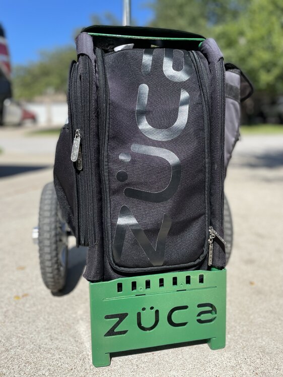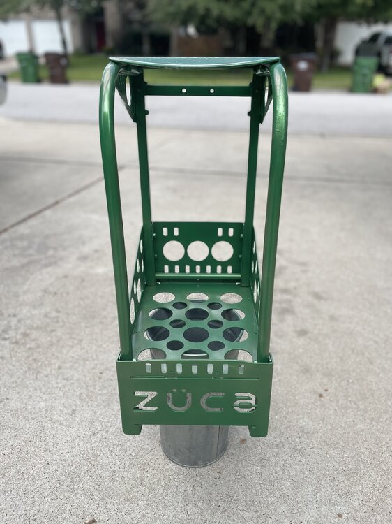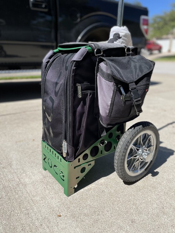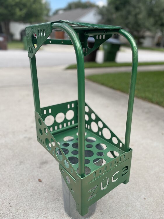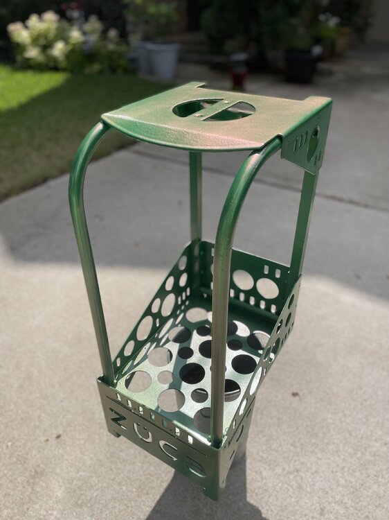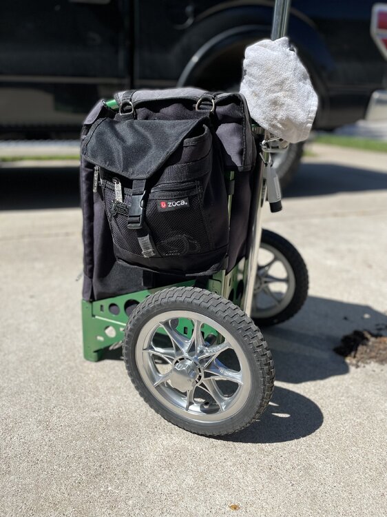 5. Hello fellow DG homies! I've been playing a great deal lately and recently joined a thursday night "league" in Round Rock. We rotate around the Round Rock, Georgetown, Pflugerville, and Belton area. Wanted to share some pics on a Zuca Cart another player gave me. It was broken and needed some love, but free is free. A new paint job will do wonders. Original was black and I sprayed it chrome including the black plastic wheels. It's looked ok, but not really what I wanted so I shifted and painted the cart with Green to Copper Colorshift paint. I power washed it and washed the bag and side bags with bleach in the washer. It was fairly dirty and needed some replacement parts, but got those in and with some extra help in being handy, I got her back on her feet. Let me know what you think and (Slap Hands) good round everyone.