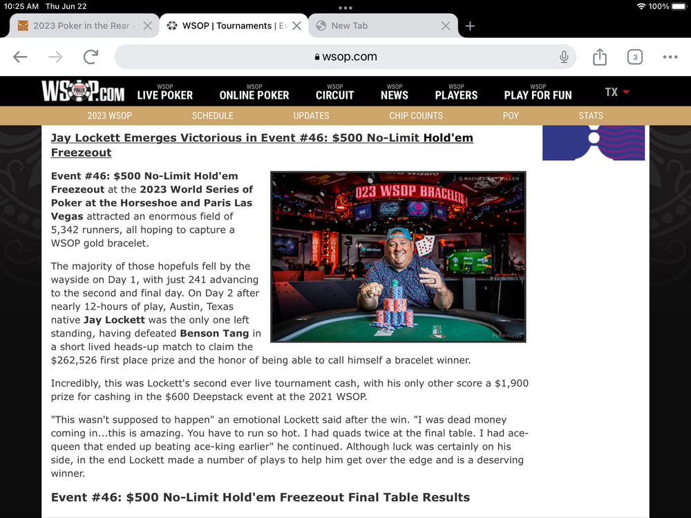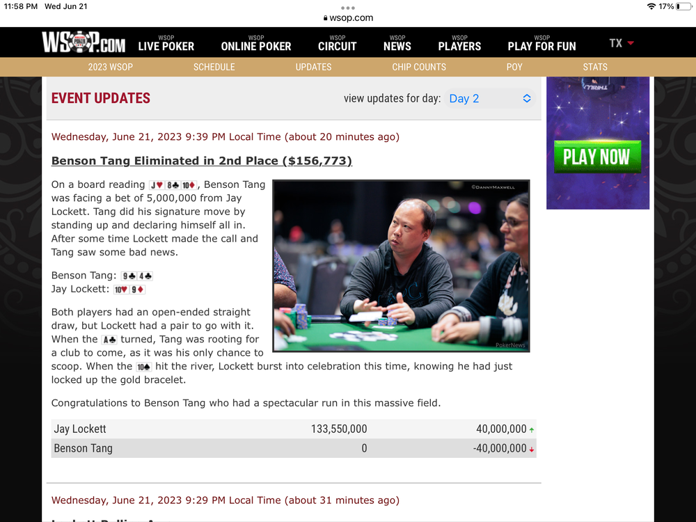 10. All the updates were odd. Not well written but they kept us informed throughout the day. I’ll be there with him next year. oh, not a bad payday. Won $262k on a $500 buy in.