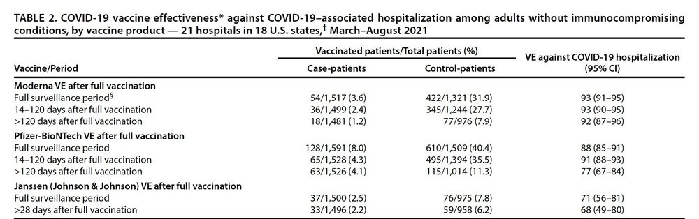 Interesting MMWR published today. https://www.cdc.gov/mmwr/volumes/70/wr/mm7038e1.htm?s_cid=mm7038e1_w Key table: Moderna dominance continues. This is in 21 hospitals. It is good news, but Jesus, the UK and Israel are making the US public health system look horrible. Our data sets are small, inconsistent, and fragmented. It is really difficult to get good large scale data sets in the US in a timely fashion. The pandemic has really exposed how vulnerable and unorganized we are.