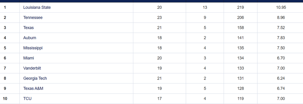 Below is the Perfect Game rankings referred to in the above post. Click on link for entire list. Note this does not include portal. With the addition of Yeskie as pitching coach, LSU has a very strong coaching/recruiting staff. Combine with Marucci and NIL money... but you have to play the game on the diamond. HS commits Top 100 Points Avg Player College Recruit Rankings Class of 2024 | Perfect Game USA Texas - Perfect Game Baseball Player College Commitments