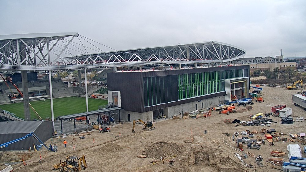 The building where the team store and beer hall will be is looking good. I believe this view is overlooking what will become the HEB Plaza. The "end caps" are going on the roof structure as well.