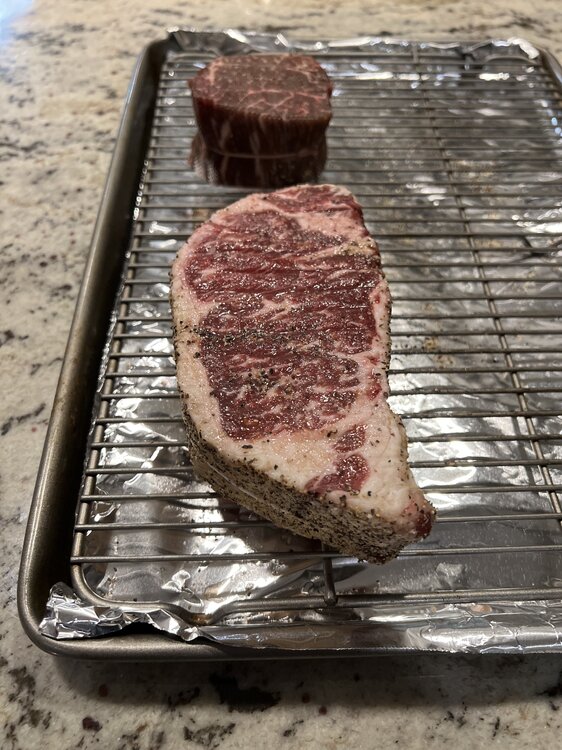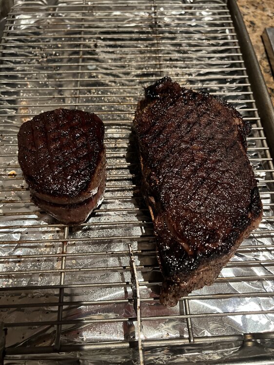 My unprofessional opinion on grill pans v. flat surfaces is that grill pans actually allow the oils and rendered fats to more evenly sear the meat. I usually rock the pan back and forth a few times while cooking The oils are so hot they almost fry the surface like bacon and the grill surface allows them to flow underneath but making contact with the steak. In a flat pan the oils can’t channel underneath the meat as evenly and it’s harder to maintain consistent contact across the cooking surface.