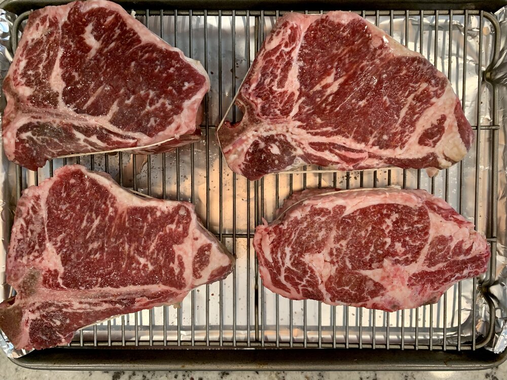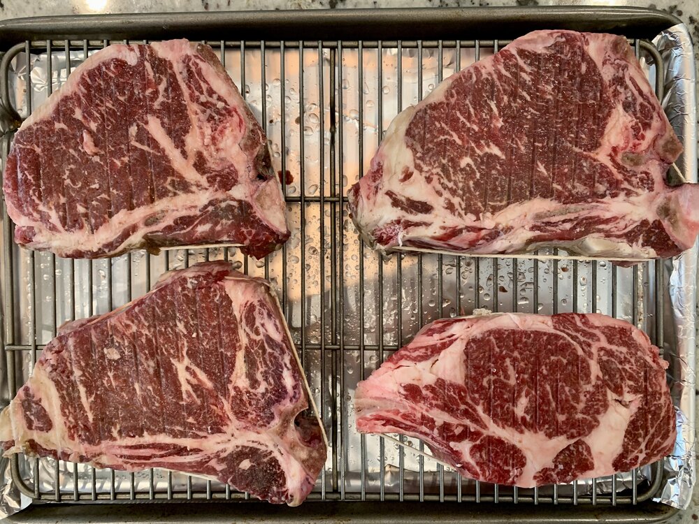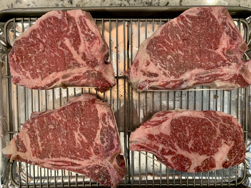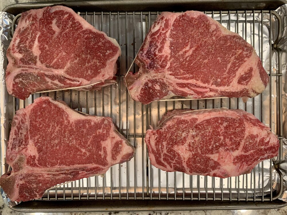 14. This morning Mrs. Brown Water left for a week long girls trip. My first act as a temporary bachelor was to stop by HEB to stock up for the next week. They had some good prime t bones and ribeye on sale so I picked them up and got the dry brine started. I’ll be working from home most of the week so I should have a chance to document progress. I’m a big proponent of salting well ahead of cooking and thought it might be interesting to show how a steak changes over a couple days. Below is around 10am. Brine is a combination of fine (which I think acts like a primer) and course (but more like kosher than the usual size) Himalayan pink salt.