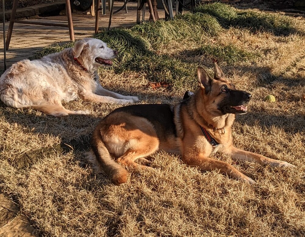 25. My old Golden, Mollie, and hullabelew’s GSD, Tillie, hanging out.