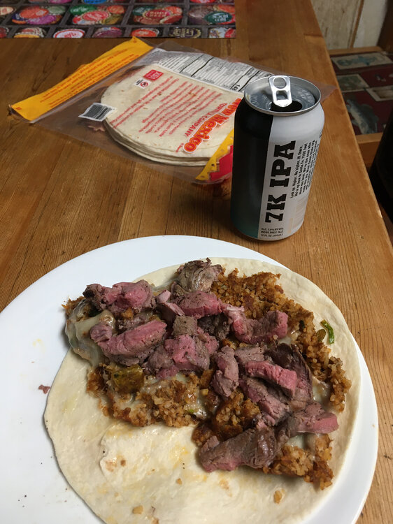 8. browned up some boudin from Earl's in Lafayette (good shit), melted a little provolone over the top, then lightly warmed up some leftover beef tenderloin from Christmas Eve in the same skillet, and walla, a burrito to hold me down in the hot tub after snowboarding all morning. may have to do it again, tomorrow.