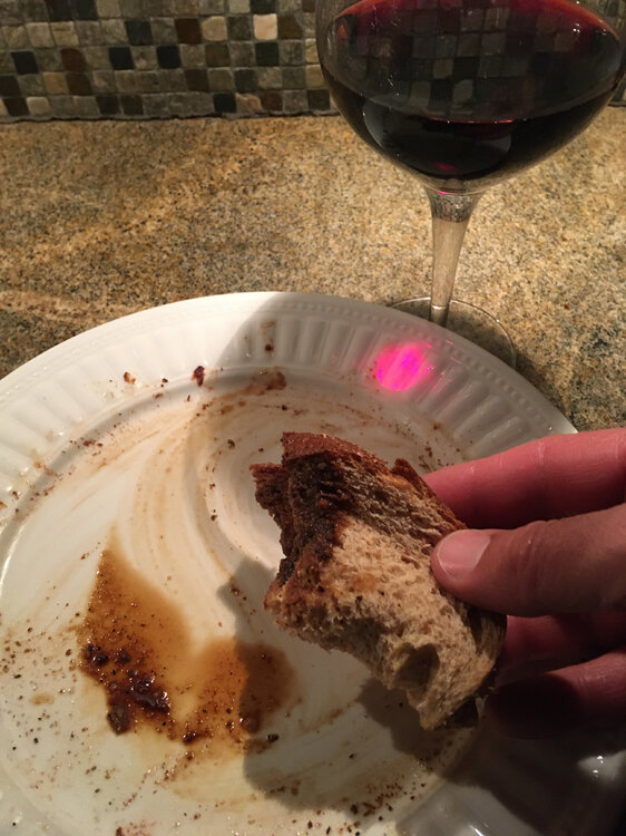 15. looped into the kitchen for a wine refill and noticed no one had done the dishes after the steak dinner I cooked. figured the least I could do to help out was clean the plate I brought the meat in from the grill on. back to work.