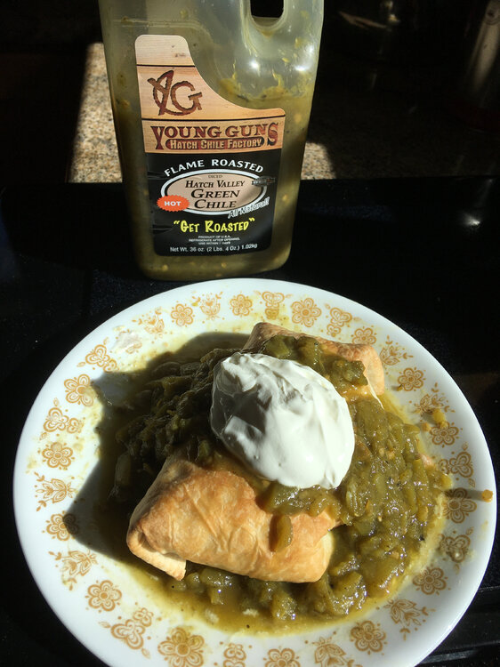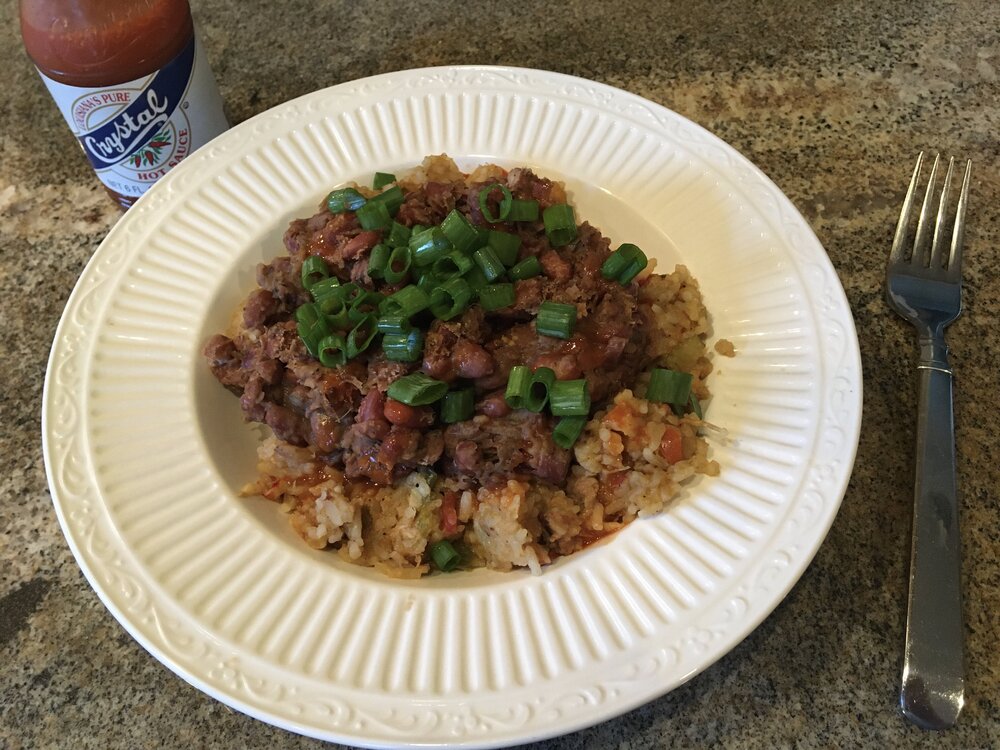 3. was gonna put these in the Shank thread, but they're kinda snooty over there. homemade chimichanga, with a sauce I picked up at Der Market in Red River, over Christmas. filled with pintos and some HEB roto chicken, cubed seasoned and reheated in a skillet with some cilantro and onion, then mixed with jack cheese and a little crema. as close as I could get to Chuy's version. sour cream because this is the first sauce I've ever bought in NM that I found to actually be hot. this was from that rainy weekend of Thanksgiving. wife's uncle lives in Lafayette and gave us a bunch of boudin. we hung out, talking food and cooking the whole time. with nothing better to do when I got home, I cooked up a some of red beans, collard greens (with the remaining ham hocks) and a batch of jambalaya. gave half the jambalaya to a neighbor, half the collards to my dad, but still had too much food, so I lived on variations of this for a week: RB&J