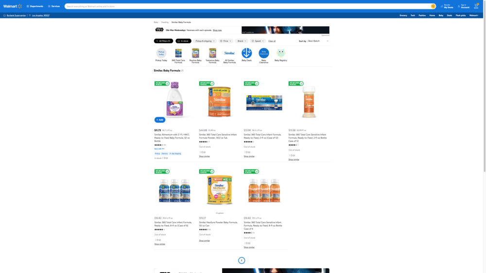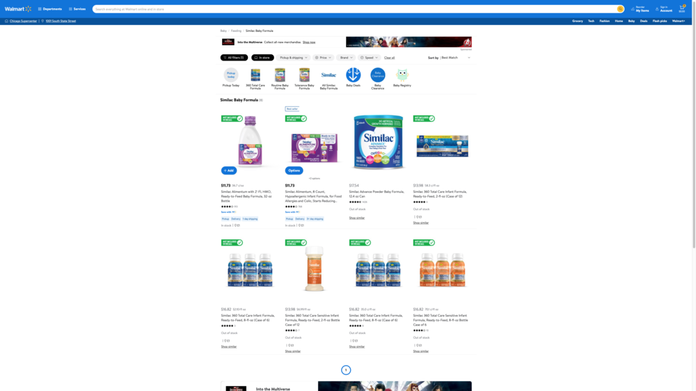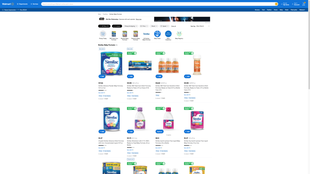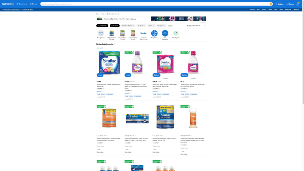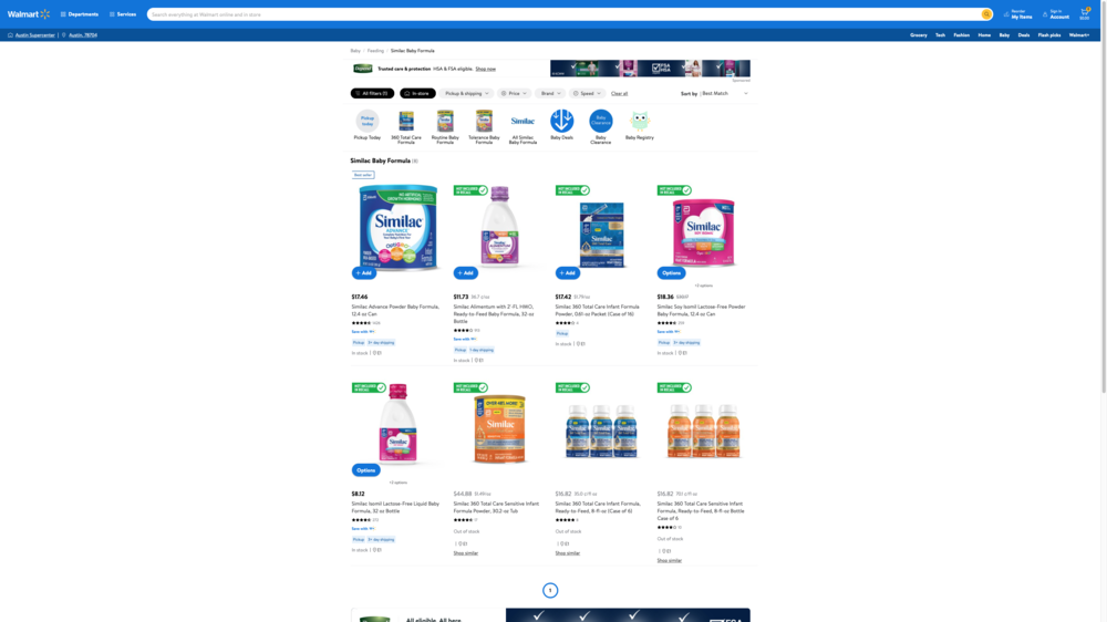 10. May not be your preferred brand, but it looks like Walmart in Austin has 9 options currently in stock. https://www.walmart.com/ip/Similac-Advance-Powder-Baby-Formula-12-4-oz-Can/14018005?fulfillmentIntent=In-store&athbdg=L1600 https://www.walmart.com/ip/Gerber-Good-Start-GentlePro-Non-GMO-Powder-Infant-Formula-with-Iron-12-7-oz-Canister/14662909?fulfillmentIntent=In-store https://www.walmart.com/ip/Similac-Alimentum-with-2-FL-HMO-Ready-to-Feed-Baby-Formula-32-oz-Bottle/19477013?fulfillmentIntent=In-store https://www.walmart.com/ip/Similac-Advance-Liquid-Toddler-Formula-13-oz-Can/14018027?fulfillmentIntent=In-store https://www.walmart.com/ip/Gerber-Good-Start-GentlePro-Non-GMO-Powder-Infant-Formula-32-oz-Canister/220464834?fulfillmentIntent=In-store https://www.walmart.com/ip/Similac-360-Total-Care-Infant-Formula-Ready-to-Feed-8-fl-oz-Case-of-6/503786377?fulfillmentIntent=In-store&athbdg=L1600 https://www.walmart.com/ip/Earth-s-Best-Organic-Gentle-Easy-To-Digest-Milk-Based-Infant-Formula-with-Iron-21-oz-Can/300358900?fulfillmentIntent=In-store https://www.walmart.com/ip/Similac-Soy-Isomil-Lactose-Free-Liquid-Baby-Formula-13-oz-Can/14018035?fulfillmentIntent=In-store https://www.walmart.com/ip/Similac-Isomil-Lactose-Free-Liquid-Baby-Formula-32-oz-Bottle/14018036?fulfillmentIntent=In-store