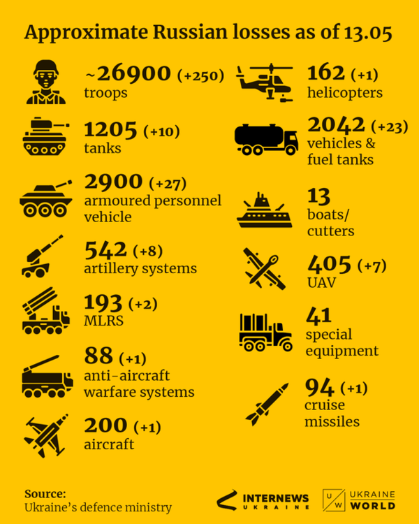 11. Gerasimov was absent from the May 9th parade. Oleksiy Arestovych says preliminary info suggests Gerasimov has been sacked. Whoever they replace him with is likely a big downgrade. Gerasimov is relatively competent. Fingers crossed. Arestovych's info is usually pretty reliable. Also rumors the Commander of the Black Sea Fleet sacked and arrested, as well as 3 more generals. A lot of Russian officers should be extremely nervous. We're at the point in musical chairs when they start removing 5-6 chairs at a time. https://www.independent.co.uk/news/world/europe/putin-russian-military-gerasimov-ukraine-b2077884.html?