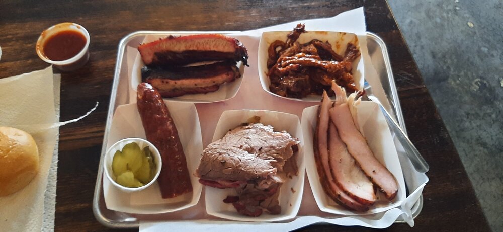 I checked out Crossbuck Barbecue today. Tim McLaughlin and Damian Avila from Lockhart Smokehouse have opened their own joint in Farmers Branch just east of Midway on Spring Valley. Today was their first day open. I thought it was really good. The ribs were not over cooked like most places. The pulled pork was done in a spicy black molasses sauce. Turkey, Brisket, and Sausage were all on point.