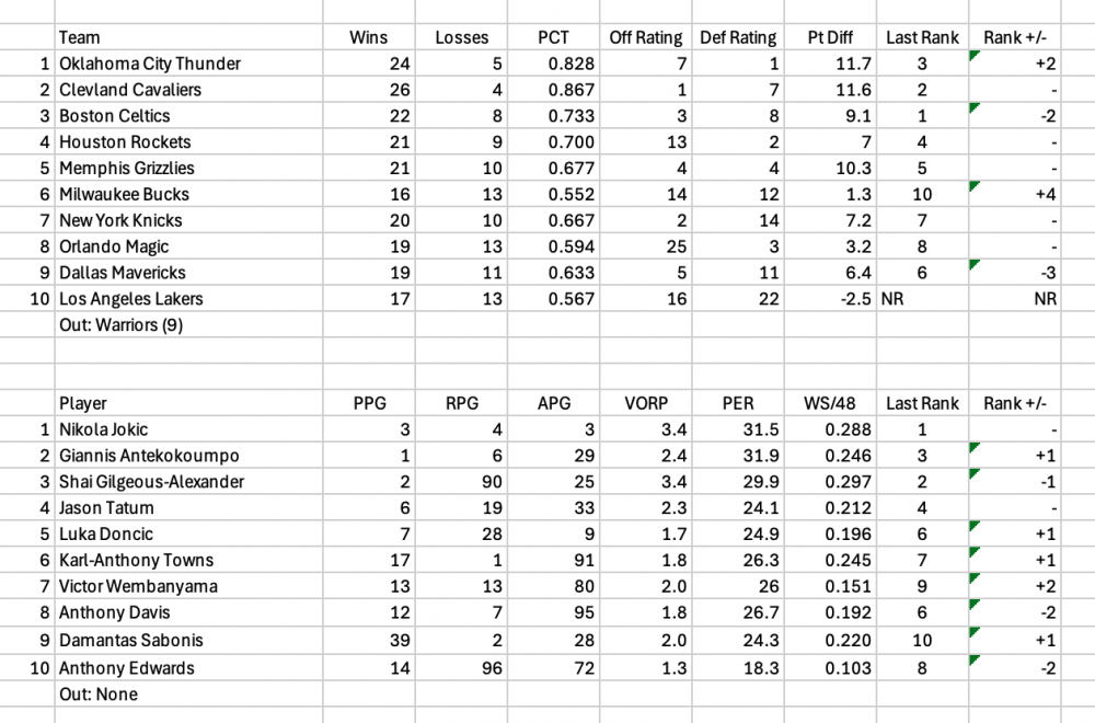 The Bucks rise up the charts, partially because of their showing in the NBA Cup, but they have been really consistent over the past 15 or so games. The Mavs fall a bit, playing .500 ball in their last 6 and now having no Luka for the next ~month. I said the Lakers were probably out of the rankings for good, but they pop back in, despite a -2.5 points per game average. I gave them the nod over mids like the Spurs, Suns, Clips, Wolves because of their 14-7 record against the West, which is the 2nd best in the conference.