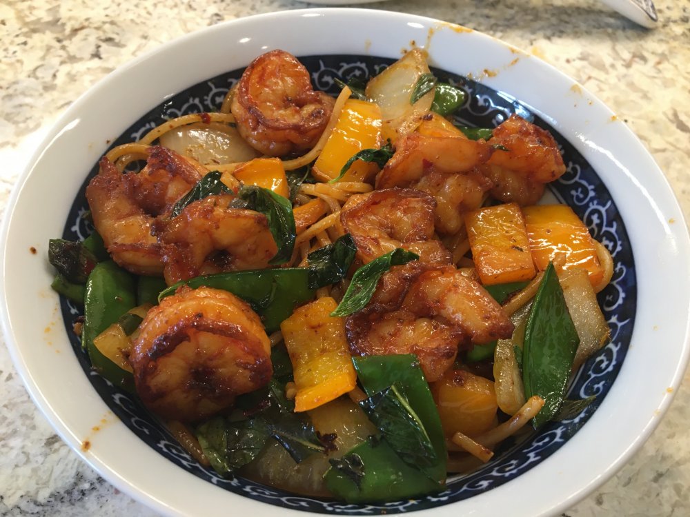 19. Puya pepper marinated shrimp stir fry with onion, yellow bell pepper, snow peas and basil with noodles. For one:
