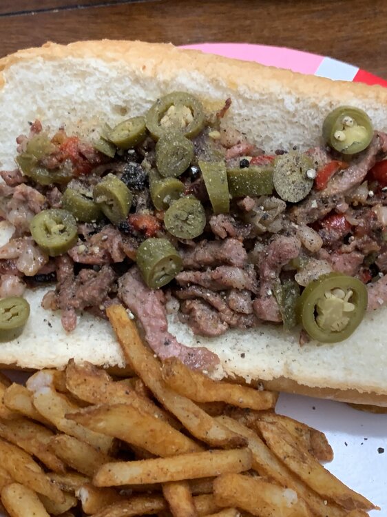 16. Bought some of those thin sliced ribeyes at H‑E‑B. Cut them up into thin strips, a little olive oil and butter, onions and red/green bell peppers and made some homemade Philly steak sammiches. Turned out delicious. cooked them in my cast iron on the charcoal grill so they had a little Smokey flavor as well. paired with H‑E‑B seasoned fries in the air fryer. Good quick meal