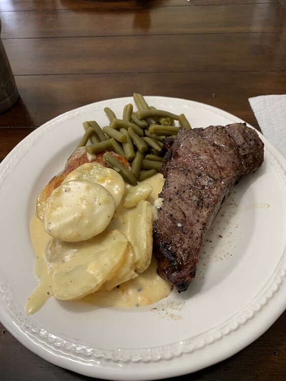 15. Some NY Strips w/ homemade scalloped Yukons. Forgive me for the canned green beans as my fresh green beans sat for a day too long in the fridge and fucking froze.