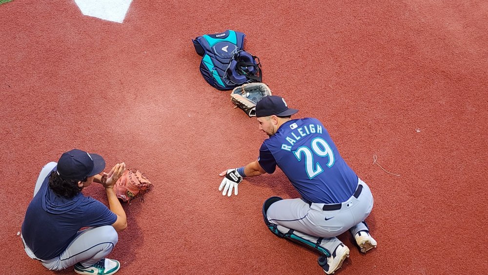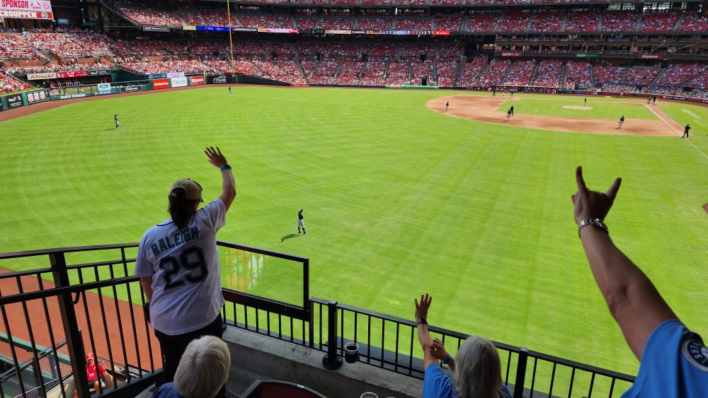 At Sunday's game, we were in the 703 club, which is like a suite level, with all you can eat and drink inside a lounge area, and a few rows of seats outdoors under the upper decks. Between innings, Randy Arozarena would warm up, then look for M's fans to toss the ball to. My wife got his attention - she had an M's jersey on, and her glove - so he threw her a ball. It was off the mark just enough, and it fell to the lower seats. I could tell he wanted to make that throw, so next inning he found her at her perch, and threw a perfect strike, which she caught! It was an amazing throw, and a great catch. Here they are waving to each other - mutual respect - plus a random horns up.
